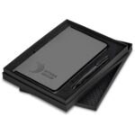 The soft and smooth, matte material of this hard cover notebook contrasts gracefully with the black metal frame, and the elasticated pen loop and painted edges finish off the product. It’s packaged together with a high performance Alex Varga Ball Pen to create a premium writing set. Notebook 21 ( l ) x 13 ( w ) x 1.8 ( h ) cm paper, PU and metal 192 lined pages (96 sheets) Pen: metal Presentation box: 24 ( l ) x 19 ( w ) x 3 ( h ) cm