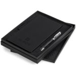 The soft and smooth, matte material of this hard cover notebook contrasts gracefully with the black metal frame, and the elasticated pen loop and painted edges finish off the product. It’s packaged together with a high performance Alex Varga Ball Pen to create a premium writing set. Notebook 21 ( l ) x 13 ( w ) x 1.8 ( h ) cm paper, PU and metal 192 lined pages (96 sheets) Pen: metal Presentation box: 24 ( l ) x 19 ( w ) x 3 ( h ) cm