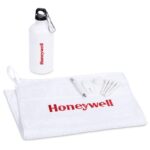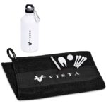 A refreshing and useful set, ideally suited for gifting on a golf day. The contents are presented in a transparent PVC pouch which can be branded with your logo or message. This Golf Set Includes: PVC pouch: 15 ( h ) x 8 ( w ) x 24 ( h ) cm Erinvale Golf Towel (GOLF-7505) 50 ( l ) x 35 ( w ) cm 400g/m2, 100% cotton plastic carabiner on towel to clip on golf bag flat strip woven into the towel for customer branding Altitude Braxton Aluminium Water Bottle – 500ml (DW-6595) aluminium 500ml screw-on cap silver carabiner clip-on cap mini pencil with eraser divot tool ball marker four golf tees packaged together in a clear PVC pouch
