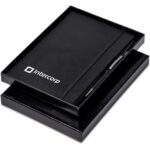 For a well-presented notebook and pen set at a reasonable price, look no further than this set. The notebook has painted page edges which match the colour of the ribbon, and the elastic closure and pen loop. The aluminium ball pen has a rubberised finish, and contains a good quality, black German ink refill, which will write for a minimum of 1,500 metres. Notebook: 21.3 ( l ) x 14.2 ( w ) x 1.8 ( h ) cm paper & PU 160 lined pages (80 sheets) Ball Pen: aluminium with black German ink Presentation Box: 22.5 ( l ) x 16.7 ( w ) x 2.1 ( h ) cm