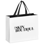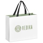 This medium white gift bag, enhanced with contemporary colour inners, offers an elegant look and feel, making it a suitable choice for special occasions. A new design innovation eliminates the traditional back fold line, ensuring a seamless finish for a premium look. 32.5 ( l ) x 12 ( w ) x 26 ( h ) cm 230g/m2 art card & webbing matte finish white paper bag with colour inner black webbing handles paper bag without the fold line at the back panel bulk packed