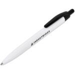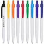 Branding on the white barrel of this economical but reliable ball pen is most effective when matched to the colour of the clip and pusher. ABS glossy finish black German ink minimum 800 Metres writing distance bulk packed