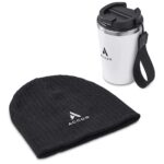 A comfy beanie is supplied packed inside a double-wall coffee tumbler with a secure, screw-on lid and a handy finger loop. The set includes: Kooshty Luca Stainless Steel Tumbler (DR-KS-283-B) 14.5 ( h ) x 9 ( d ) cm PP, stainless steel, PU & nylon 350ml double-wall plastic & stainless-steel design secure screw-on lid secure drinking port cap Nebraska Acrylic Beanie (CAP-1751) acrylic cable rib knit packaged in a natural kraft Kooshty gift box