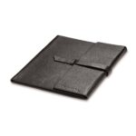 The textured PU surface and the strap closure give this folder a classic look and feel, which can be enhanced by subtle deboss branding. litchi PU 32 ( l ) x 24 ( w ) x 2.2 ( h ) presentation box: 33.7 ( l ) x 26.5 ( w ) x 2.7 ( h ) pocket pen loop writing pad included bulk packed