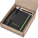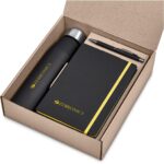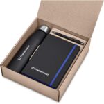 An aluminium bottle with a matte painted finish, an A5 notebook with a strap closure and a metal ball pen are neatly presented together in a gift box. The pen has a soft, matte finish and reveals a matte, light grey finish when lasered. This set is suitable as a client gift, or for staff and onboarding of new members to the team. A pre-packaged gift set not only looks impressive, but can also be a convenient and practical option when it comes to transport and delivery. The box 27 ( l ) x 23 ( w ) x 7.5 ( h ) cm made from natural kraft board This gift set includes: Altitude Lamda Lite Aluminium Water Bottle – 700ml (DR-AM-229-B) 24.7 ( h ) cm aluminium, stainless steel 700ml matte painted finish stainless steel lid single wall Altitude Sigma A5 Hard Cover Notebook (NF-AM-168-B) 21 ( l ) x 14.3 ( w ) x 1.3 ( h ) cm paper & PU 128 lined pages (64 sheets) matching colour ribbon, page edges and elasticated closure Altitude Omega Ball Pen (PEN-1901) aluminium black German ink minimum 1,500 metres writing distance rubberized barrel