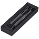 The rubberised finish of this slim ball pen and pencil feels comfortable to the touch, and contrasts nicely with the glossy black trims. They’re packaged together in a presentation box made from Kraft paperboard. The box is 17.2 ( l ) x 5.2 ( w ) x 2.2 ( h ) cm. Pen: aluminium matte rubberised barrel with glossy black trims black German ink minimum 1,500 Metres writing distance Pencil: aluminium matte rubberised barrel with glossy black trims includes 2 x 0.7mm leads