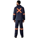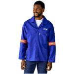 200g/m2 100% cotton twill open neck collar • front yoke panel • concealed zip • chest pocket features V-flap with press stud closure and pen pocket two side pockets • triple needle top stitching • bar tacks at stress points orange/silver 50mm reflective tape detail on arms and back Locally Manufactured YKK Zip day/night visibility