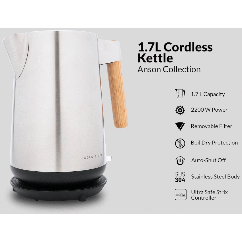 Bring warmth and elegance to your kitchen with the Boden Stark Anson Collection Kettle. Crafted with a genuine red oak handle and lid knob, and powered by a fast-boil 2000W heating element, it blends timeless design with modern functionality.1.7L Capacity – Ideal for family use or entertaining2000W Power – Fast and efficient boilingStrix Controller – Advanced safety and temperature precisionRemovable Filter – For cleaner water and easy maintenanceRed Oak Handle & Lid Knob – Authentic wood for a refined finish