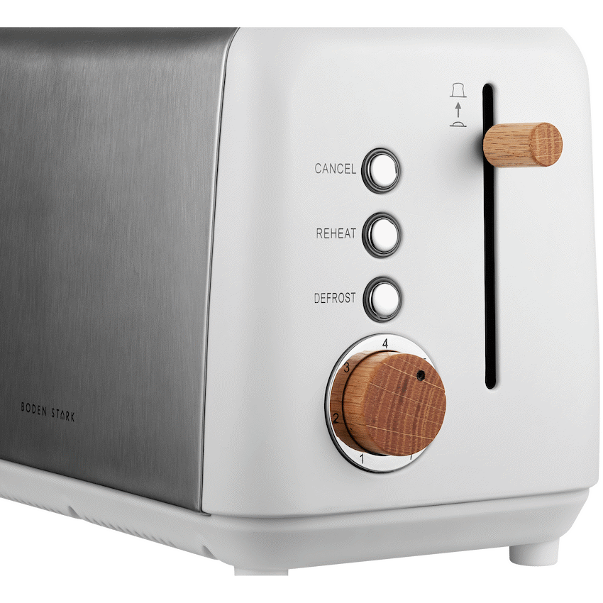 Bring natural elegance and precise performance to your countertop with the Boden Stark Anson Collection Toaster. Featuring a sleek stainless steel body and genuine red oak knobs, it’s built to elevate both your kitchen and your breakfast routine.Stainless Steel Housing for durability and modern appeal7-Level Browning Control for the perfect toast, every timeGenuine Red Oak Knobs for a warm, premium finishCancel, Reheat & Defrost Functions for total toasting versatility