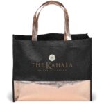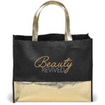 A high fashion shopper for those glitz and glamour events.   38 (w ) x 10 ( d ) 30.5 ( h ) cm 80g/m2 non-woven the metallic bottom panel on the front and back metallic carry handles bulk packed