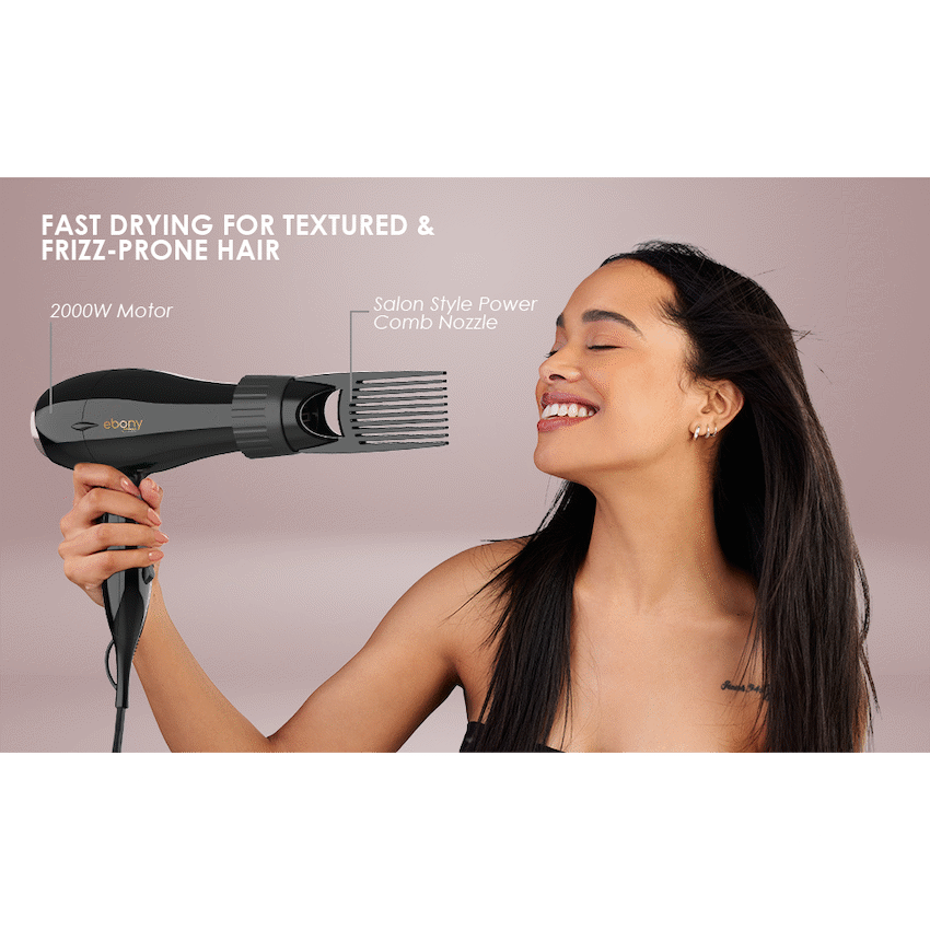 Experience professional styling with the Carmen Ebony Power Comb Hairdryer. Equipped with a powerful 2000W motor and a salon-style power comb nozzle, it delivers focused airflow for quick drying and precise styling. The cool shot function locks in your look, while the hanging loop offers easy storage.Powerful 2000W Motor for efficient dryingSalon-Style Power Comb Nozzle for targeted airflowCool Shot Function to set stylesHanging Loop for convenient storage