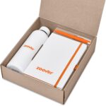 A white recycled stainless steel bottle, an A5 notebook with coloured page edges, and a soft-touch barrel plastic ball pen are neatly presented together in a gift box. This well-matched set is suitable as a client gift, or for staff and onboarding of new members to the team. A pre-packaged gift set not only looks impressive, but can also be a convenient and practical option when it comes to transport and delivery. The box is 27 ( l ) x 23 ( w ) x 7.5 ( h ) cm, and is made from natural kraft board. This gift set includes: Kooshty Bermuda Recycled Stainless Steel Bottle  23 ( h ) cm recycled stainless steel 800ml single wall not for hot water not microwave safe the bottle can go into the dishwasher but not the lid Altitude Tundra A5 Hard Cover Notebook  21 ( l ) x 14.3 ( w ) x 1.3 ( h ) cm paper & PU 128 lined pages (64 sheets) matching colour ribbon, page edges, elasticated closure and pen loop Altitude Quest Ball Pen ABS black German ink   When selecting the dome sticker branding option, please note that debossing is required at an additional charge. This process creates a recess for the dome sticker to fit into, reducing the chance of it peeling off easily.