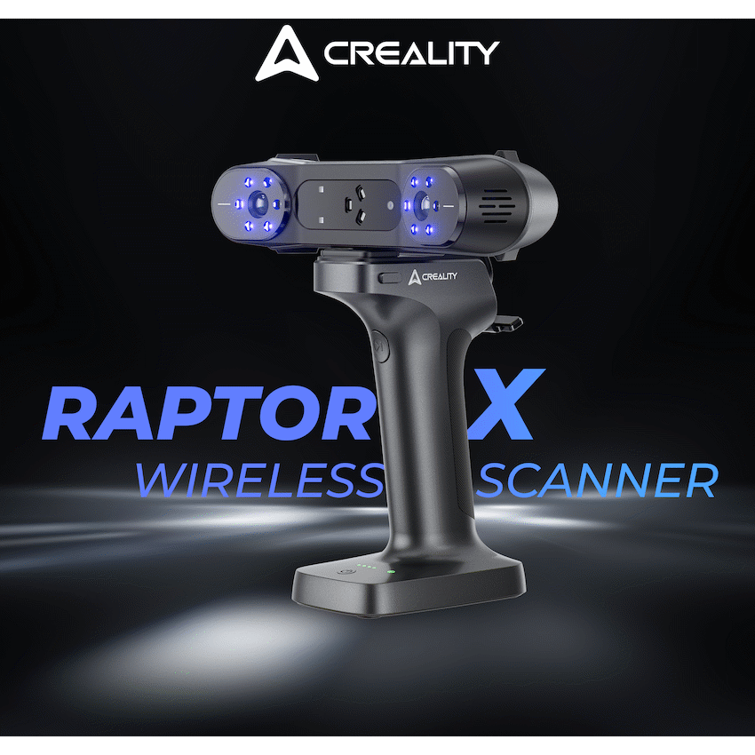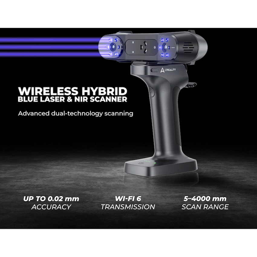 The Creality Raptor X Wireless 3D Scanner is the world’s first hybrid blue laser and NIR scanner, setting a new standard for professional 3D scanning. Designed for ultimate flexibility, it captures both intricate details and large-scale objects with metrology-grade precision.Equipped with 34 cross + 7 parallel blue laser lines, plus NIR structured light, the Raptor X scans objects from 5 mm up to 4000 mm with accuracy as fine as 0.02 mm. This makes it equally effective for jewellery, automotive parts, full-body scans, or large-scale design projects.Truly portable and wireless, the Raptor X connects via Wi-Fi 6 for lightning-fast, low-latency data transfer-delivering smooth, real-time scanning without cables holding you back. Lightweight and handheld, it’s built for fieldwork, studios, or industrial use, wherever high-speed precision is needed.Whether for reverse engineering, digital archiving, product design, or quality inspection, the Raptor X brings professional-grade 3D scanning into a compact, powerful, and cable-free workflow.