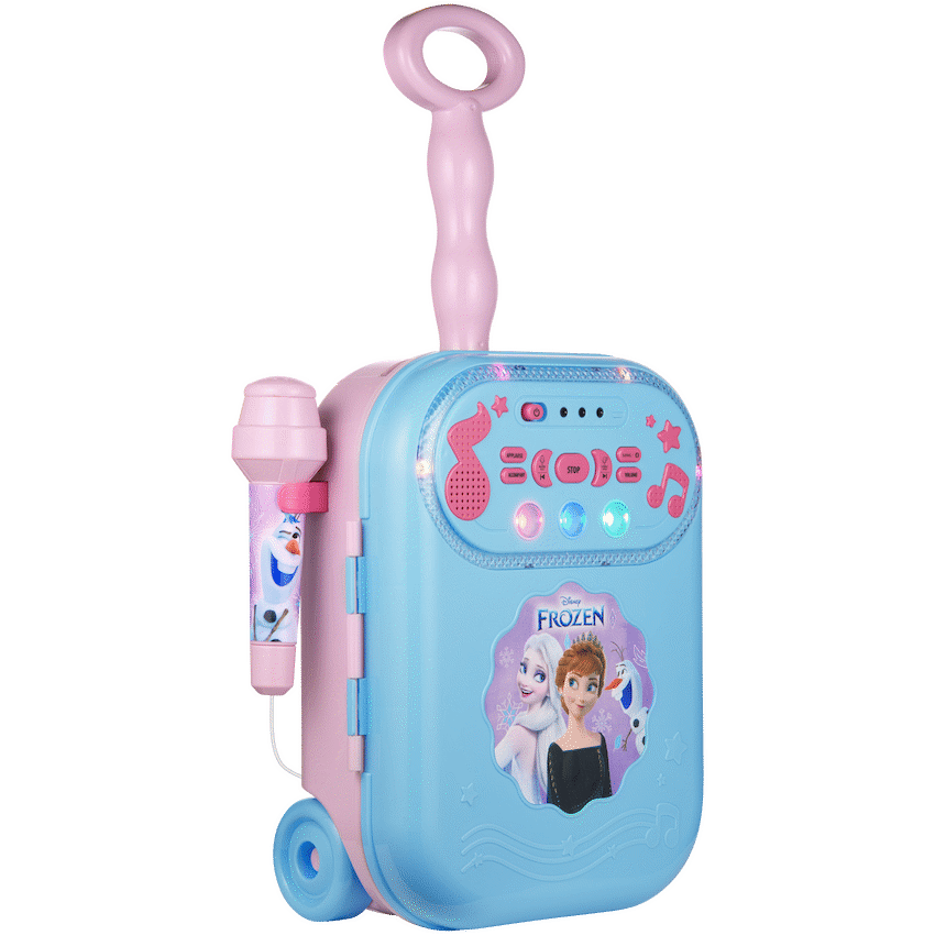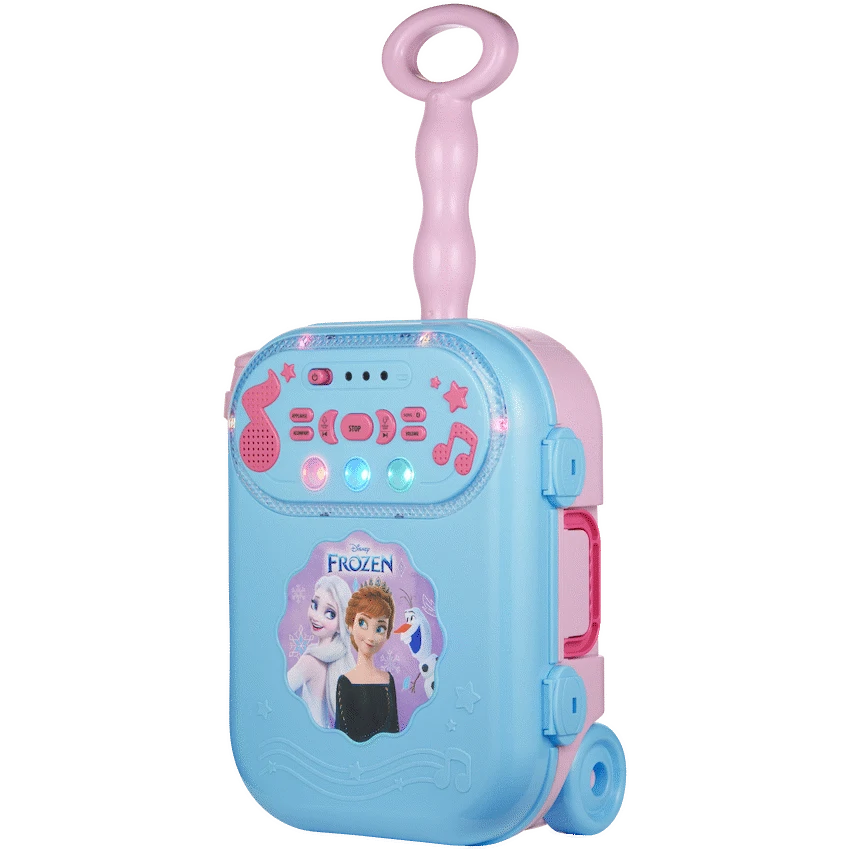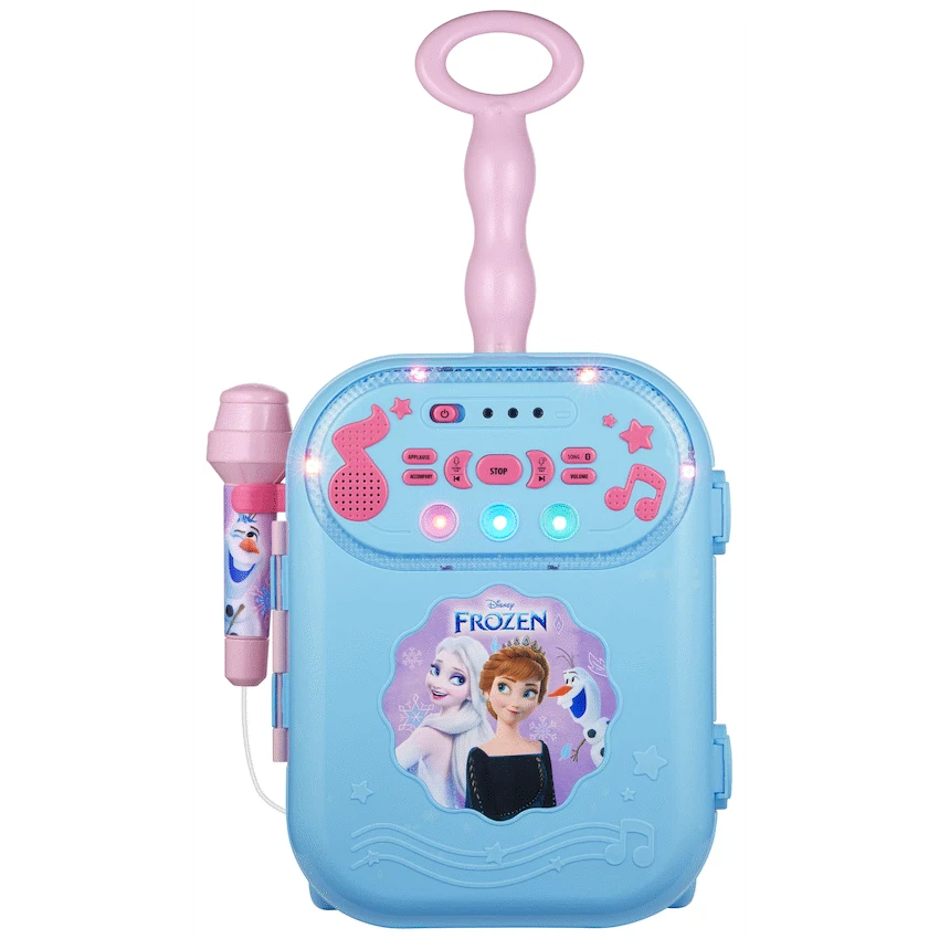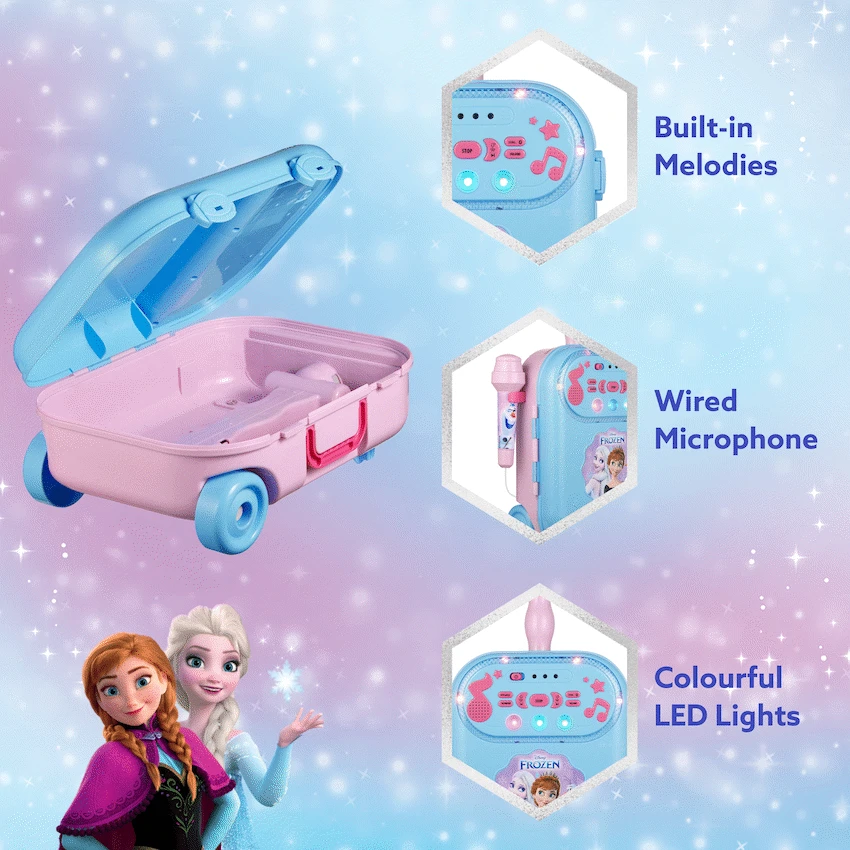 Bring the magic of Arendelle home with the Frozen karaoke machine every child dreams of! The Disney Frozen Bluetooth Wheely Karaoke Machine is a showstopper for any aspiring young star. Designed for kids who love to sing, dance, and perform, this all-in-one karaoke set offers wireless convenience, built-in songs, voice-changing fun, and dazzling lights-all in a wheely, portable design that’s perfect for parties, playdates, or everyday fun.Whether your little one wants to belt out “Let It Go” or remix their own voice, this kids Bluetooth karaoke speaker delivers hours of interactive entertainment. With wireless playback via Bluetooth, a built-in microphone port, and the ability to record and play back performances, your child becomes the star of their own Frozen show. Safe, easy to use, and irresistibly fun, this is the ultimate gift for any young Disney fan.Feature Highlights:Built-In Songs for Instant Fun – Start singing Frozen hits right out the boxWireless Singing via Bluetooth – Enjoy cable-free connection to phones and tabletsRecord and Replay Your Performances – Save your superstar moments to relive laterFun Voice-Changing Effects – Switch up your sound for laughs and creativityColourful Lights Enhance the Show – Create a Frozen-themed stage vibe anywherePortable Wheely Design – Easy to roll and carry to any party or roomIncludes Wired Microphone – Plug in and sing like a pro right awayTechnical Specifications:Bluetooth Version: V5.1Bluetooth Range: 10-15mDriver Size: 40mmImpedance: 8?Speaker Wattage: 0.5WSignal to Noise Ratio: 85 dBSensitivity: 52 dBFrequency Response: 2.2-12kHzBattery: Requires 4 x AA batteries (not included)Materials: PP, ABSWhat’s in the Box:Disney Frozen Bluetooth Wheely Karaoke MachineDisney Frozen Wired MicrophoneAuxiliary CableInstruction ManualLet your child’s imagination and voice soar with this delightful Frozen karaoke experience. Perfect for birthdays, holidays, or everyday musical adventures!