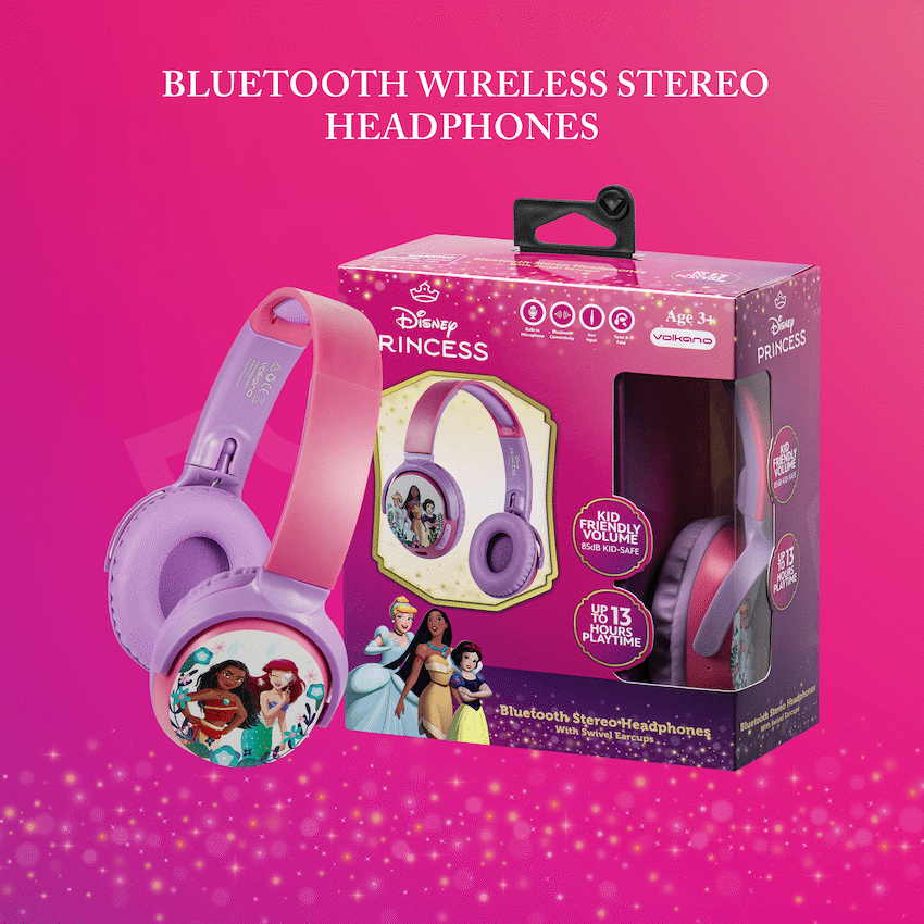 Let your child enjoy their favourite tunes with the Disney Princess Kids Bluetooth Headphones, designed for safe and joyful listening. These wireless headphones combine enchanting Disney style with essential kid-friendly features like an 85dB volume limiter and long-lasting battery life-perfect for young ears and long adventures.With up to 13 hours of wireless playtime, these headphones keep the music going whether at home, on road trips, or during quiet time. The foldable design makes them easy to pack and store, while the optional aux cable provides flexibility for use when Bluetooth isn’t available. Plus, the built-in mic lets kids take calls or chat on video without removing their headphones.Whether it’s story time, music, or e-learning, the Disney Princess 9955 Series delivers the magic of Disney with the practicality parents trust.Feature Highlights:Kid-Safe Volume Limiter – Capped at 85dB to protect young earsAll-Day Wireless Play – Enjoy up to 13 hours of Bluetooth playbackFoldable Design – Compact and travel-friendly for school or holidaysWired & Wireless Options – Use Bluetooth or plug in via aux cableBuilt-In Mic – Hands-free calling for added convenienceTechnical Specifications:Bluetooth Version: 5.3Chipset: JL7003Profiles: A2DP, AVCTP, AVDTP, AVRCP, HFP, SPP, SMP, ATT, GAP, GATT, RFCOMM, SDP, l2CAPRange: 10mDriver Size: 40mmImpedance: 32?Frequency Response: 20Hz – 20kHzSensitivity: 85 +/- 3dBBattery: 150mAhCharging Time: 2 HoursPlayback Time: 13 Hours (50% Volume), 10 Hours (100% Volume)Charging Port: USB-CCharge Input: 5V ? 1AWhat’s in the Box:Disney Princess Bluetooth Wireless Stereo HeadphonesUSB-C Charging CableAux CableInstruction ManualLet your little one step into a world of sound and imagination-safely, wirelessly, and in Disney style