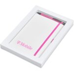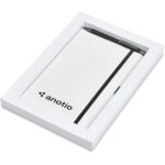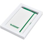 The matching matte textures of this notebook and pen, combined with the colour accents, makes them perfect partners. The set is packaged together in a box with a firm cardboard base and a transparent acetate lid, which provides bright and clear exposure for your branding. Tundra A5 Hard Cover Notebook 21 ( l ) x 14.3 ( w ) x 1.3 ( h ) cm paper & PU 128 lined pages (64 sheets) matching colour ribbon, page edges, elasticated closure and pen loop Omega Ball Pen aluminium black German ink minimum 1,500 metres writing distance rubberized barrel box: 22 ( l ) x 19 ( w ) x 2.2 ( h ) cm paper and acetate When selecting the dome sticker branding option, please note that debossing is required at an additional charge. This process creates a recess for the dome sticker to fit into, reducing the chance of it peeling off easily.