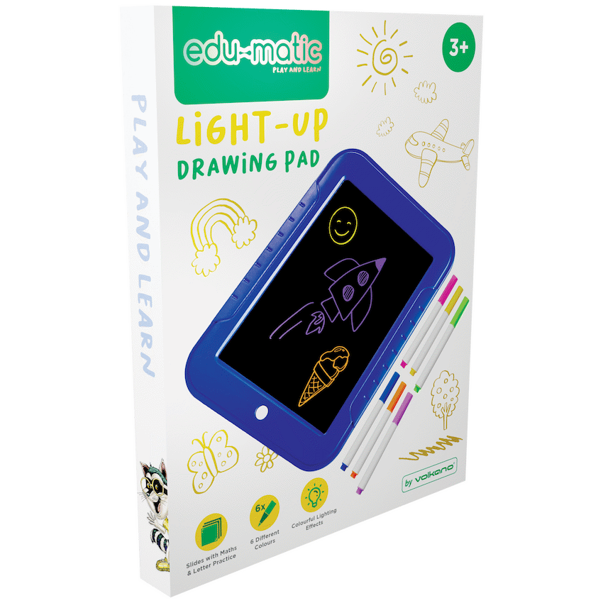 Whether your kids are just scrabbling, doodling or creating a work of art, the Edu-Matic Light-Up Drawing Pad will ensure creativity from a young age. This Drawing Pad lights up magically at the touch of a button. Featuring 30 slides in stencils for tracing and inspiration all the while including educational slides contributing to math’s and handwriting. Drawing pad includes 6 different colours for your child to choose from.An eco-friendly way to introduce your little Picasso to the world of art and creativity.What’s in the box1 x Edu-Matic Light-Up Drawing Pad