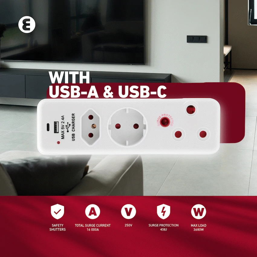 Power and protect your devices with the ELLIES 3-Way Surge Protection Adaptor with USB & Type C, your all-in-one charging and connection solution for modern homes and offices in South Africa. Designed with a sleek profile and packed with practical features, this surge protection adaptor with USB is ideal for desktops, bedside tables, or travel bags. Equipped with one 3-pin socket, one SANS 164-2 socket, and a Schuko socket with surge protection, it safely supports multiple plug types-including EU-compatible devices. It also includes dual USB charging ports (USB-A and Type-C) that deliver up to 2.4A, making it perfect for powering up phones, tablets, and other USB-powered tech. This 3 way surge plug with USB and Type C offers reliable protection with a 458J rating and 16,000A total surge current, giving you peace of mind during power spikes.