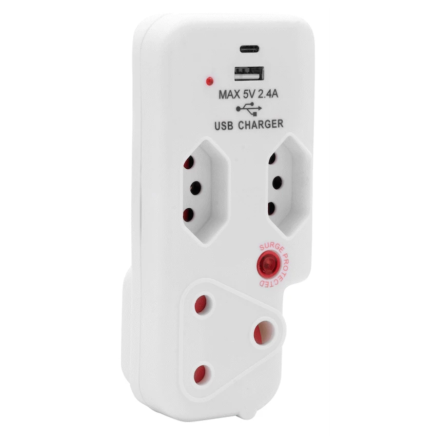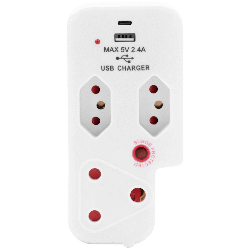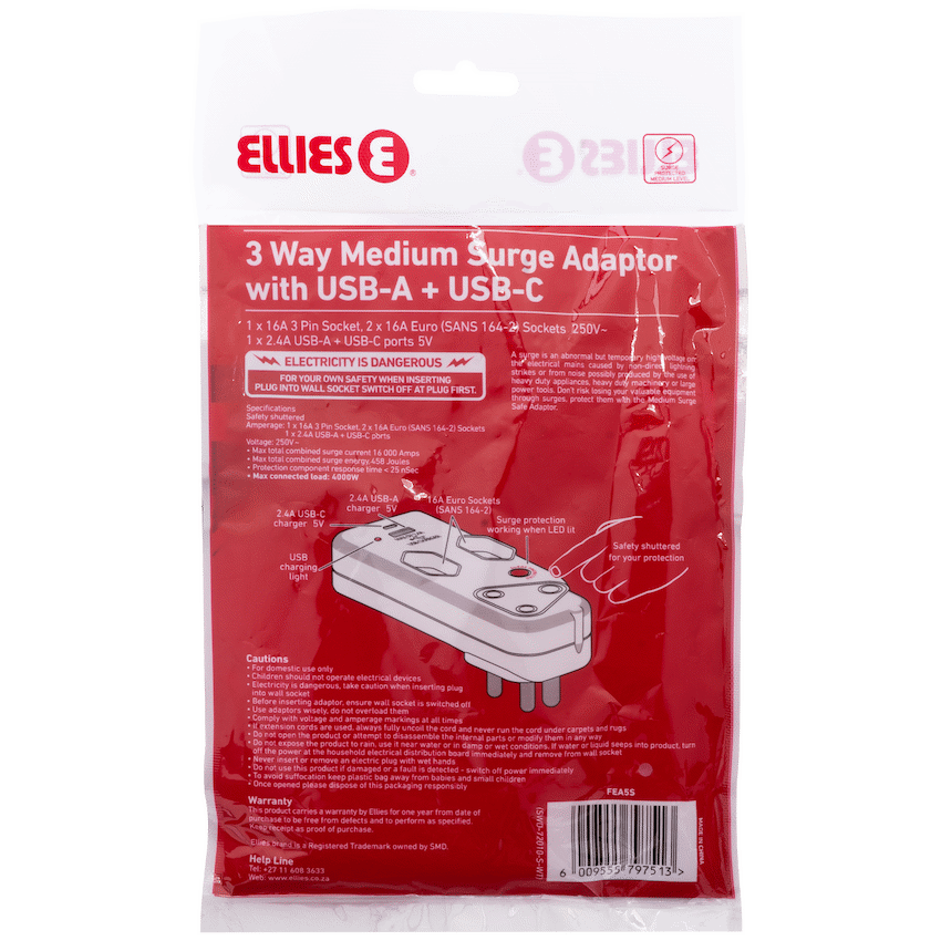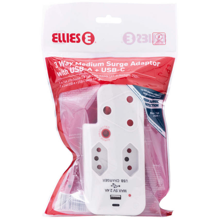Simplify your power setup and charge devices on the go with the ELLIES 3-Way Medium Surge Adaptor with USB and Type-C ports. Designed for modern households, this space-saving 3-way surge adaptor with USB combines essential socket functionality with fast, built-in charging-perfect for phones, tablets, and other USB-powered gadgets. Featuring a 458 Joule medium surge protection rating, this adaptor helps protect your connected electronics from everyday voltage spikes. It includes one 3-pin socket and two SANS 164-2 sockets, all with safety shutters for peace of mind. The USB-A and USB-C ports deliver up to 2.4A, allowing you to charge two devices simultaneously without needing bulky wall chargers. Whether you’re powering appliances or charging your phone overnight, this Type C power adaptor is a smart, compact solution that brings safety and convenience to any plug point