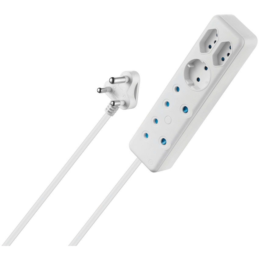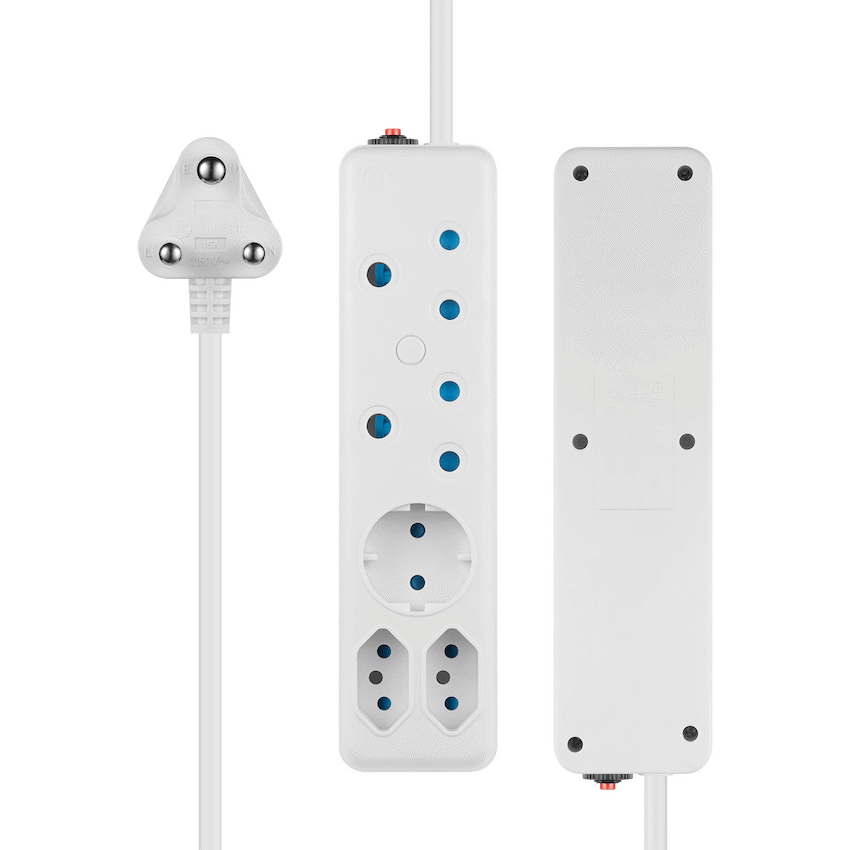 Stay powered and protected with the ELLIES 5-Way Multiplug, built for modern homes and offices in South Africa. This compact yet versatile multiplug with safety shutters gives you a safe and convenient way to connect multiple devices from a single wall socket-perfect for workstations, appliances, or entertainment setups. This ELLIES 5 way plug features two 3-pin 16A sockets, two SANS 164-2 sockets, and a 10A Schuko socket-ideal for various plug types, including EU-compatible devices. With built-in overload protection and a reset switch, it helps protect your electronics from electrical surges. The 0.5-metre cable makes it easy to manage in tight spaces without creating clutter.