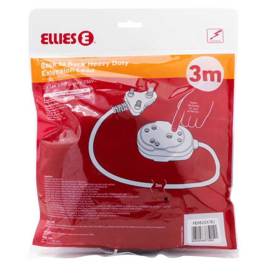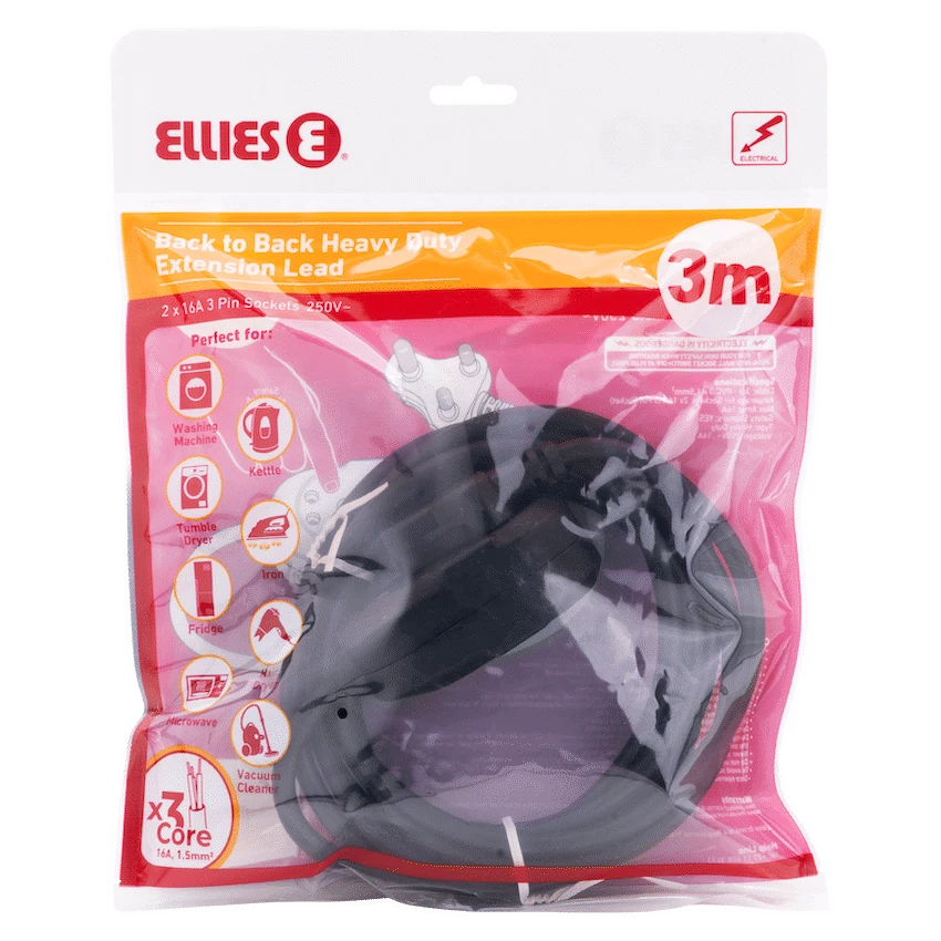 Get dependable, compact power with the Ellies Back to Back Heavy Duty Extension Lead – 3m. Whether for your office, workshop, or home setup, this heavy duty extension lead delivers safe, high-performance power where it matters most.Equipped with 2 x 16A 3-pin sockets, this Ellies extension lead supports up to 16A at 250V-perfect for powering demanding appliances, electronics, or tools. The 3-metre PVC cable (3×1.5mm2) offers just the right reach without excess clutter, while the back-to-back socket design keeps plugs neatly aligned and easy to access.Safety is top priority, with built-in safety shutters providing protection from accidental electrical contact-making this a smart choice for homes with kids or pets. Built tough for everyday use, it’s the ideal companion for any environment needing reliable, compact power.