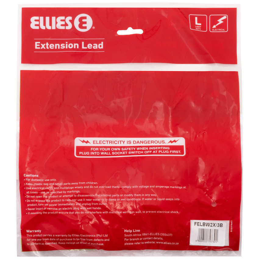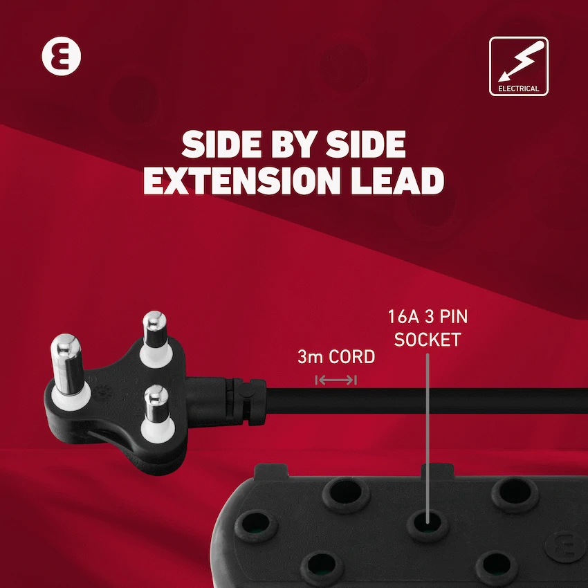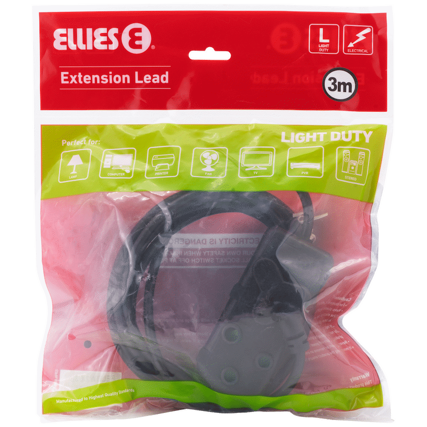 Power your daily essentials safely and efficiently with the Ellies Side-by-Side Light Duty Extension Lead – 3m. This compact and practical light duty extension lead is ideal for home, office, or study use-perfect for low-consumption devices such as phone chargers, desk lamps, and Wi-Fi routers.Fitted with 2 x 16A 3-pin sockets, it supports safe, simultaneous use of multiple devices. The 3-metre PVC cable (3×1.0mm2) offers just enough reach for short-distance power needs, while the side-by-side socket layout keeps plugs spaced and tidy for easier access.Safety is built-in with integrated safety shutters, protecting you and your family from accidental contact with live parts. Designed for daily convenience, this Ellies extension lead delivers peace of mind and dependable performance.