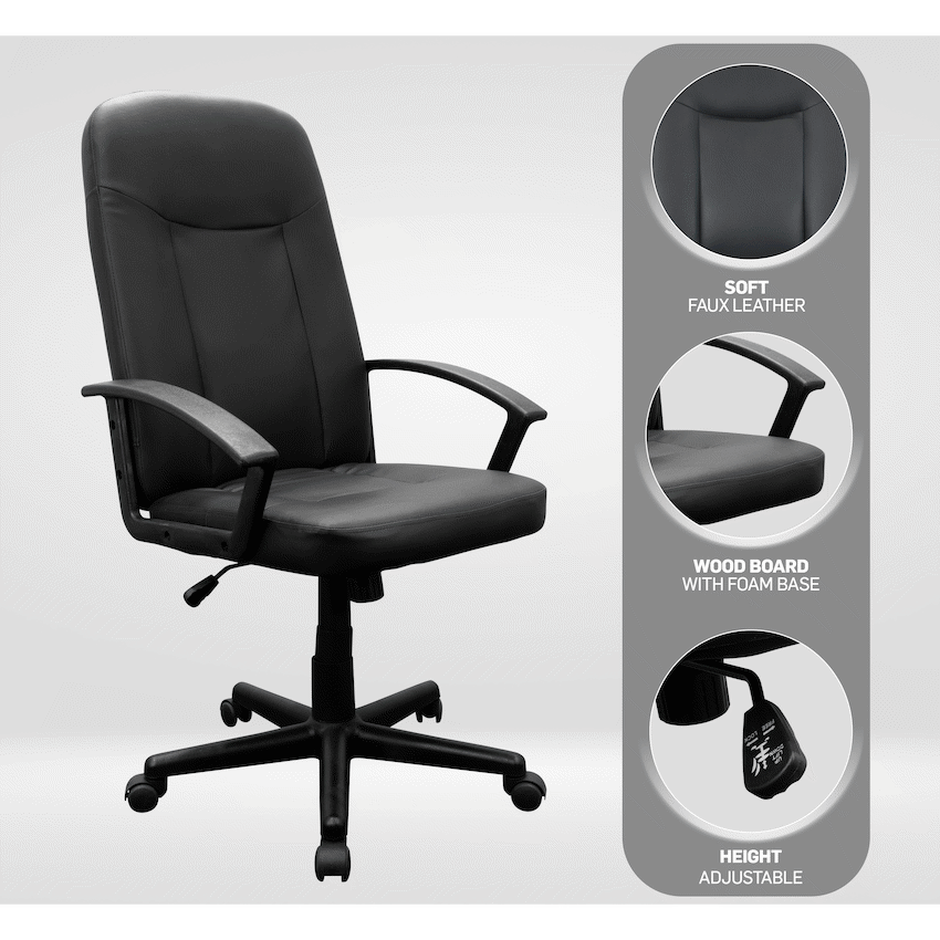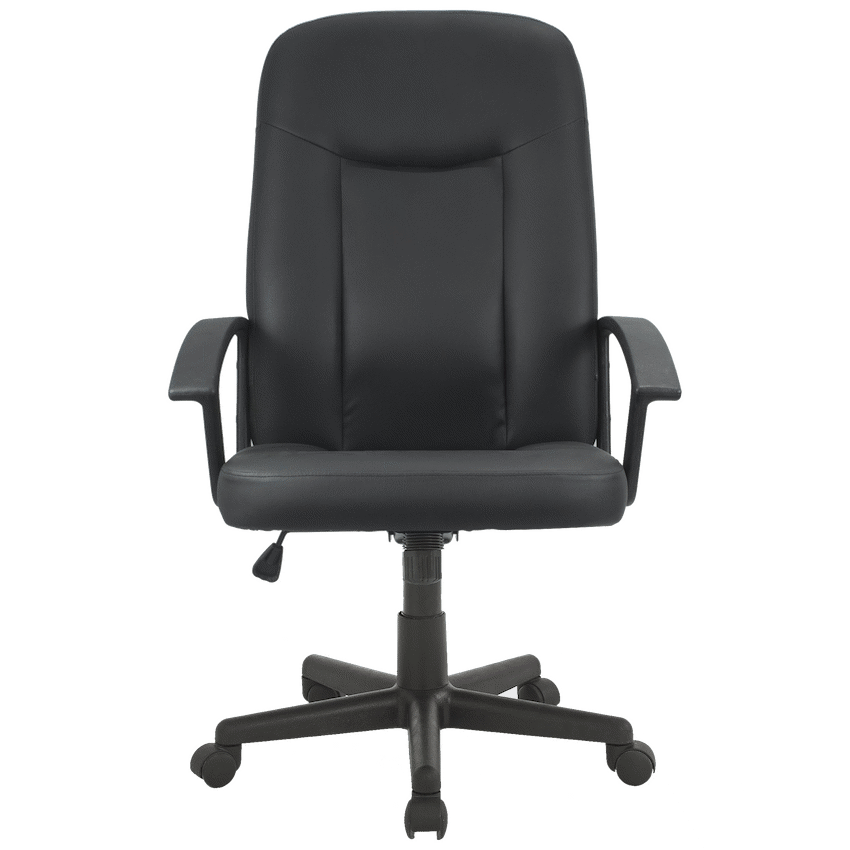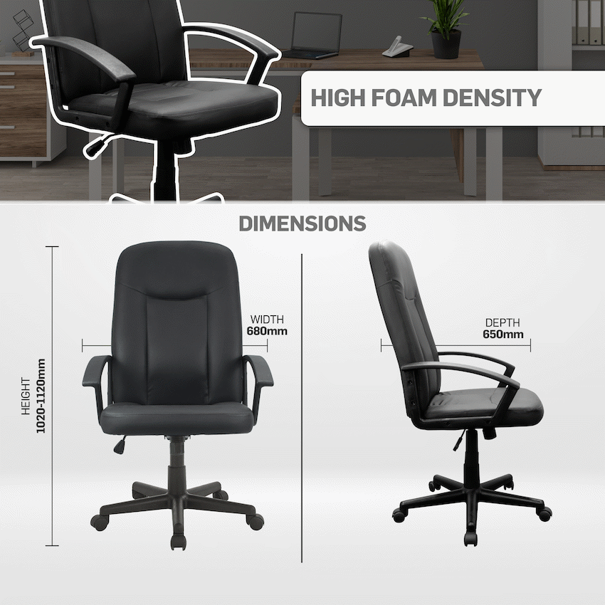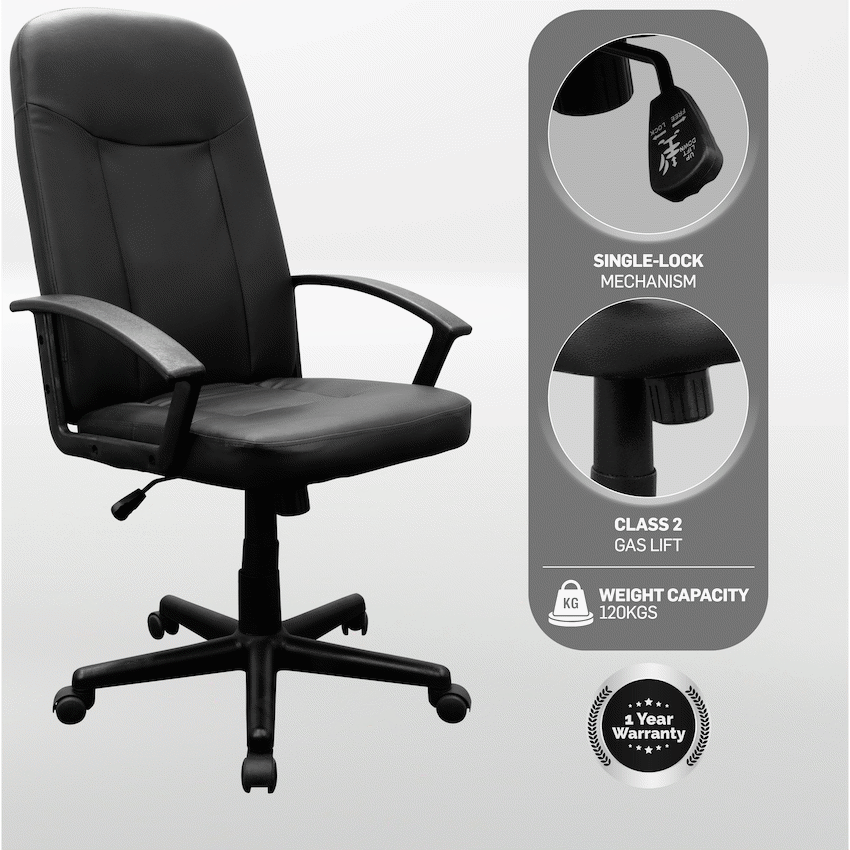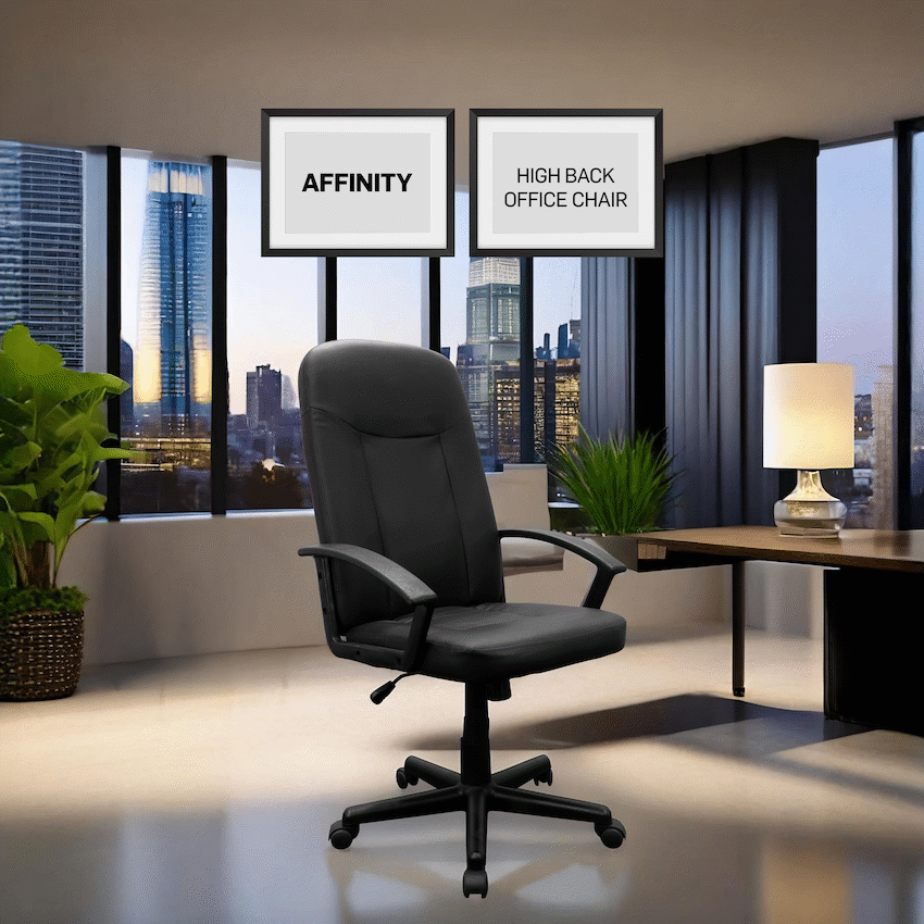 Bring comfort and professional style to your workspace with the Everfurn Affinity PU Leather Executive Office Chair. Designed for both home offices and corporate environments, this high back chair combines cushioned ergonomic support with a durable, easy-to-maintain faux leather finish.The generously cushioned backrest provides supportive comfort during extended periods of sitting, helping reduce fatigue throughout the workday. Fixed armrests offer reliable support for your arms and shoulders, improving overall sitting posture and comfort. The smooth height adjustment allows you to tailor the chair to your desk height and body size, making it suitable for a wide range of users.This PU leather office chair features a single-lock tilt mechanism that lets you recline comfortably, encouraging subtle movement to reduce stiffness during long hours at your desk. Built on a strong nylon base and PP frame, the chair delivers everyday durability while maintaining a sleek executive appearance. With a 120kg weight capacity, it offers dependable support and stability for daily use.Stylish, comfortable, and practical, the Everfurn Affinity Executive Chair is an ideal choice for those seeking a balance of comfort, durability, and professional design.Feature HighlightsCUSHIONED HIGH BACKREST – Provides ergonomic support and comfort for extended sittingPU LEATHER UPHOLSTERY – Tough, easy-to-clean faux leather keeps the chair looking newFIXED ARMRESTS – Offers reliable support for arms and shouldersSINGLE-LOCK TILT MECHANISM – Allows comfortable reclining to promote movement and reduce fatigueHEIGHT ADJUSTABLE SEAT – Easily adapts to different desk heights and user preferencesSTURDY NYLON BASE – Designed for everyday stability and durability120KG WEIGHT CAPACITY – Built to support a wide range of users with confidenceTechnical SpecificationsFabrication: PU Leather (0.7mm Thickness)Frame: PP FrameBase: NylonBase Size: 300mmMechanism: Single-LockGas Lift: Class 2Foam Type: Hybrid FoamWeight Capacity: 120kgDimensionsWidth: 660mmDepth: 650mmHeight: 1020-1120mmProduct Weight: 13kgWhat’s in the Box1 x Everfurn Affinity High Back Office ChairInstruction Manual