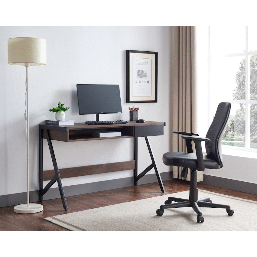 Everfurn Calantra Desk with Drawer and Storage Cavity , Powder Coated Steel Frame , Steel DrawersIntroducing the Calantra Desk – a fusion of contemporary design and functional excellence. Engineered with precise specifications, this desk strikes the perfect balance between style and practicality.With optimal dimensions of 540mm in depth, 860mm in height, and 1230mm in width, the Calantra Desk provides a spacious and versatile platform to enhance your productivity.Supported by a robust powder-coated frame, the desk ensures durability and stability, adding an industrial-chic touch to its design while guaranteeing a long-lasting and resilient structure.Featuring a substantial 15mm top board thickness, the desk provides a sturdy and reliable surface for various work activities, ensuring durability and longevity to meet the demands of daily use.Equipped with adjustable feet, the Calantra Desk allows you to customize the height according to your preference and workspace requirements. This feature ensures stability on different surfaces and adds a touch of adaptability to your environment.Elevate your workspace with the Calantra Desk – a modern and versatile addition designed to seamlessly integrate into your dynamic work environment. Redefine your work experience with this contemporary desk that combines aesthetics with practical functionality.What’s in the boxOffice Desk: Calantra SeriesAssembly Instruction
