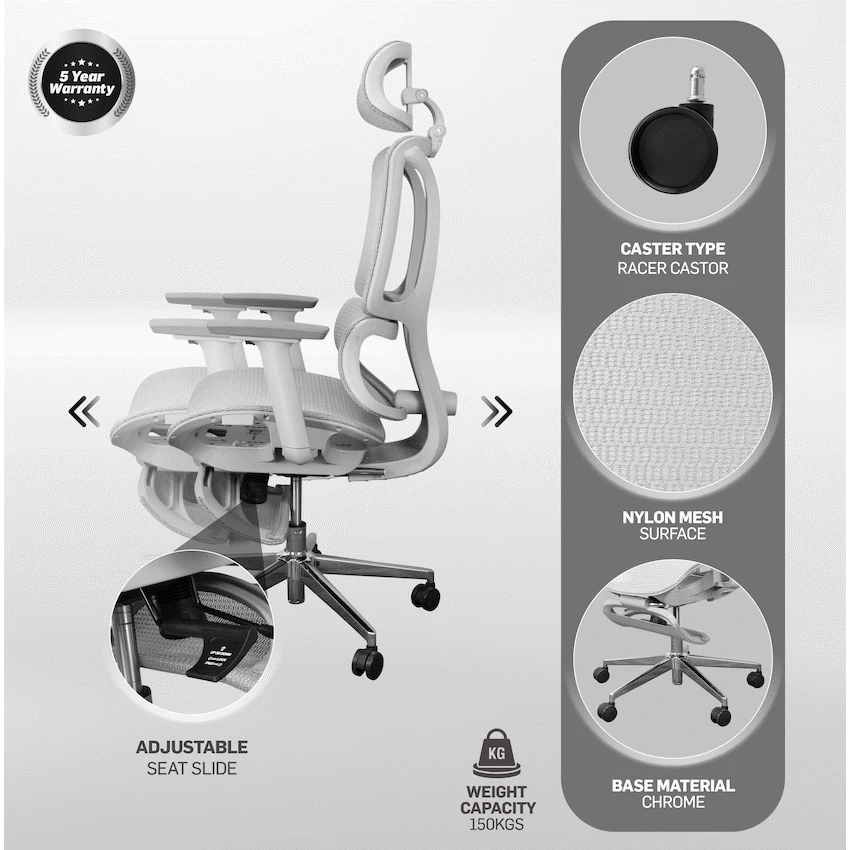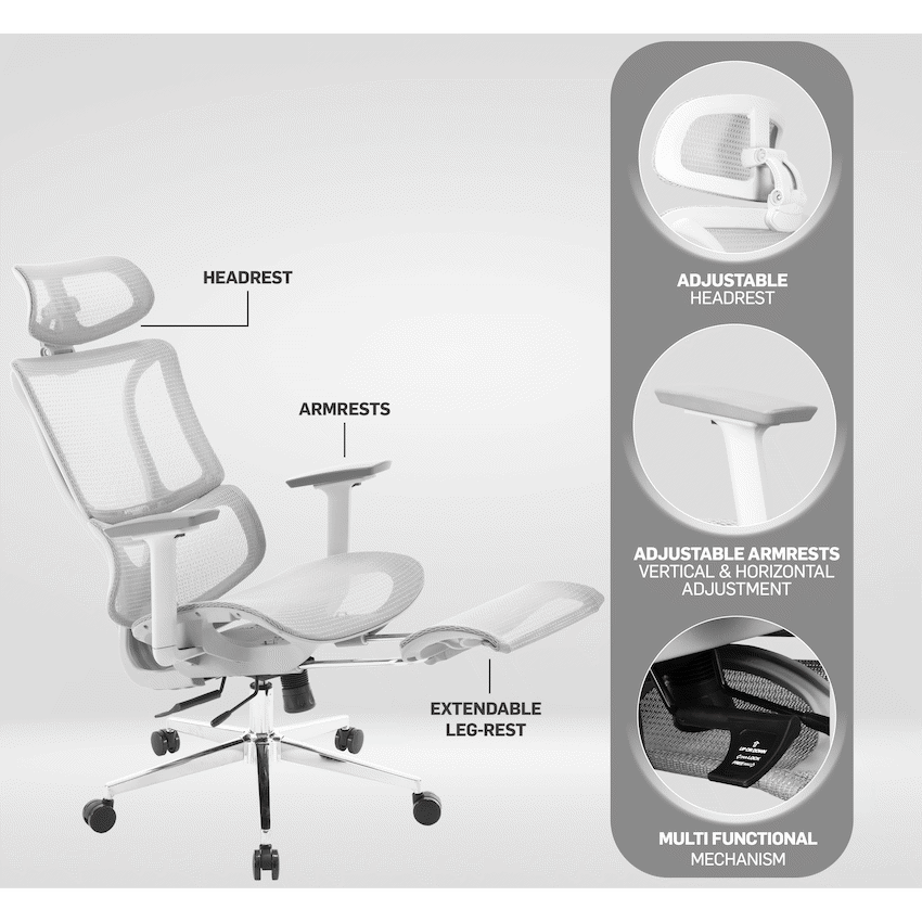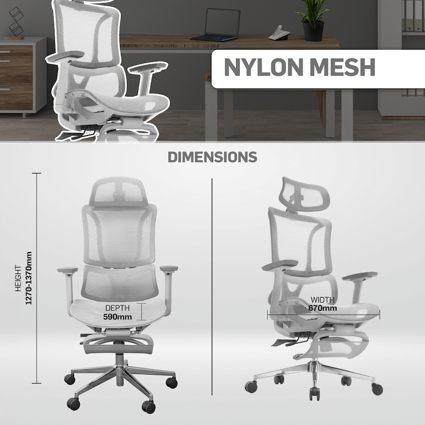 Everfurn Nebula High Back Office Chair, Ergonomic, Mesh, Nylon, Multi-Function Mechanism, Extendable Leg Rest, Chrome Base