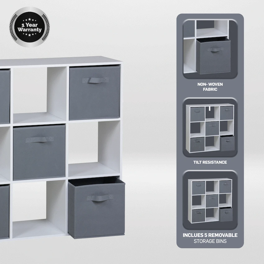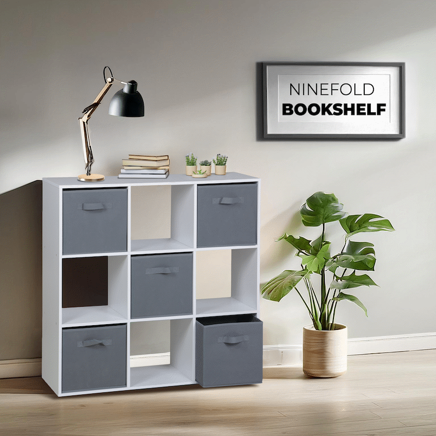 Everfurn Ninefold Bookshelf with 5 Storage Bins
