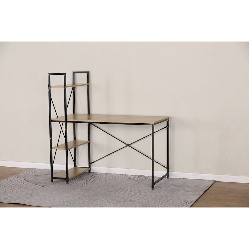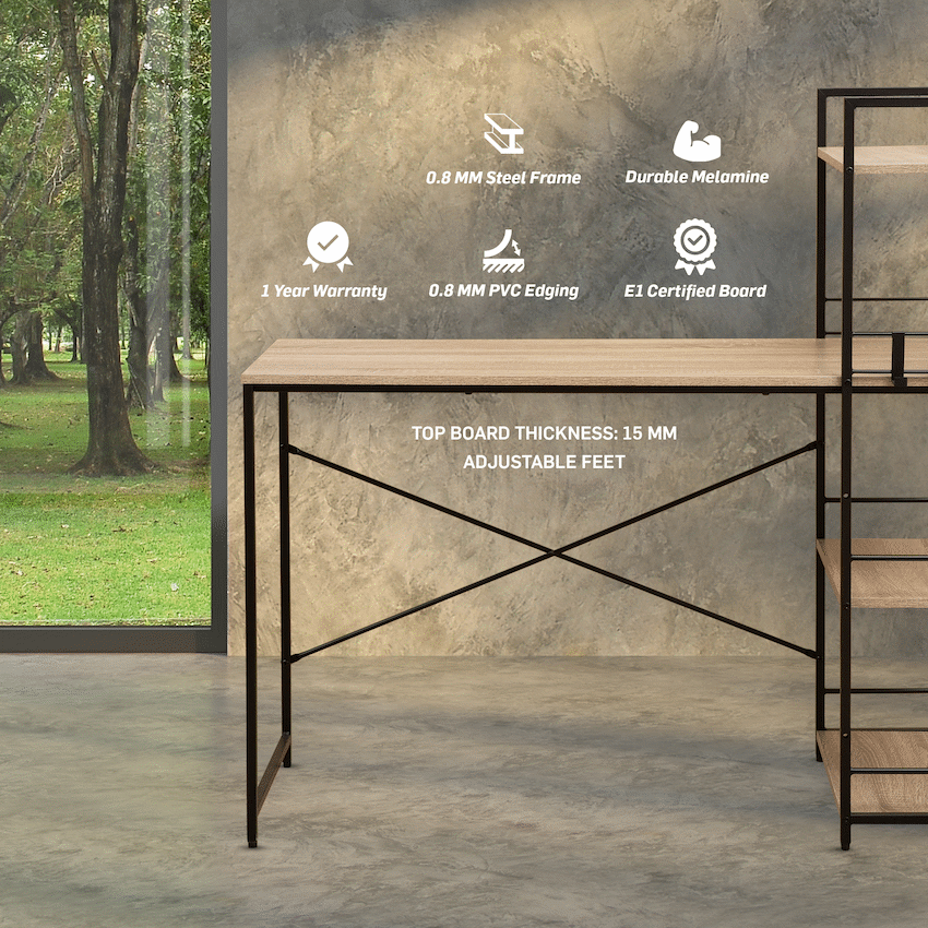 Create a productive and organised workspace with the Everfurn Regal Study Desk with Bookshelf, designed to combine modern style with practical storage. Ideal for home offices, student rooms, or compact workspaces, this computer desk with storage makes it easy to keep essentials within reach while maximising vertical space.The integrated tiered bookshelf provides generous storage for books, files, and decor, helping you maintain a clutter-free desk surface. Crafted from durable engineered wood with a protective melamine finish, the desktop is resistant to everyday water splashes and scratches, making it suitable for daily use. The powder-coated steel frame, reinforced with a cross-bracing design, delivers reliable stability, while adjustable feet ensure the desk stays level on uneven floors.Thoughtful details such as movable storage hooks add flexibility, allowing you to hang headphones, bags, or accessories exactly where you need them. With a clean, modern look and practical construction, this home office desk furniture piece fits seamlessly into contemporary interiors while offering the strength and functionality required for work or study.Feature HighlightsIntegrated Tiered Bookshelf – Vertical storage keeps books and essentials neatly organisedMovable Storage Hooks – Two adjustable hooks provide flexible hanging spaceStable Cross-Braced Steel Frame – Enhances strength and workspace securityAdjustable Feet – Ensures stability on uneven surfaces while protecting floorsDurable Melamine Surface – Water- and scratch-resistant for everyday usePowder-Coated Steel Legs – Rust- and scratch-resistant for long-lasting durabilityPVC Edge Protection – Guards against impact and wearHigh Load Capacity – Supports up to 30kg overall and 10kg per shelfTechnical SpecificationsMaterial: Engineered Wood (PB Board)Finish: Melamine Lamination with PVC EdgingFrame: Powder-Coated Steel (0.8mm)Board Thickness: 15mm (Top and Sides)Maximum Load Capacity: 30kgShelf Load Capacity: 10kg per ShelfDimensions: 1200mm x 510mm x 1200mmWeight: 16.6kgWarranty: 1 YearWhat’s in the Box1 x Everfurn Regal Desk1 x Instruction ManualUpgrade your workspace with a modern study desk that balances smart storage, durability, and contemporary design-perfect for staying organised and focused every day.