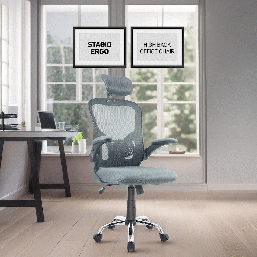 Designed for comfort, posture, and everyday reliability, the Everfurn Stagio Ergo High Back Ergonomic Office Chair is an ideal solution for home offices and professional workspaces alike. This ergonomic office chair combines breathable materials with targeted support, helping you stay comfortable and focused throughout the day.The high-back design with integrated lumbar support promotes healthy posture by supporting your lower back where it matters most. Its mesh and fabric construction allows for improved airflow, keeping you cool during extended sitting sessions. Adjustable armrests and smooth height adjustment make it easy to tailor the chair to your body and desk setup, reducing strain on your shoulders and wrists.Built with hybrid foam cushioning and a stable steel base, the Stagio Ergo offers dependable support without sacrificing comfort. The single lock mechanism ensures stable seating while allowing natural movement, and standard caster wheels provide easy mobility across most office floors. With a 120kg weight capacity and durable components, this high back office chair is made to handle daily use with ease.Whether you’re working from home, studying, or spending long hours at a desk, enjoy ergonomic support that helps you stay productive and comfortable-day after day.Feature HighlightsERGONOMIC LUMBAR SUPPORT – Supports lower back alignment to reduce strainHIGH BACK DESIGN – Encourages proper posture and full back supportBREATHABLE MESH SEATING – Promotes airflow to keep you cool and comfortableADJUSTABLE ARMRESTS – Customised arm and shoulder supportSMOOTH HEIGHT ADJUSTMENT – Easily adapts to different desk heights and usersHYBRID FOAM CUSHIONING – Balanced comfort with long-lasting supportSTABLE STEEL BASE – Strong, durable foundation for everyday useTechnical SpecificationsChair Type: High Back Ergonomic Office ChairUpholstery: Mesh & FabricFoam Type: Hybrid FoamLumbar Support: Ergonomic Built-InArmrests: AdjustableMechanism: Single LockGas Lift: Class 3Base Size: 320mmCaster Wheels: StandardMaximum Load: 120kgWarranty: 1 YearColour: GreyWeight: 11kgWhat’s in the Box1 x Everfurn Stagio Ergo Office ChairInstruction Manual