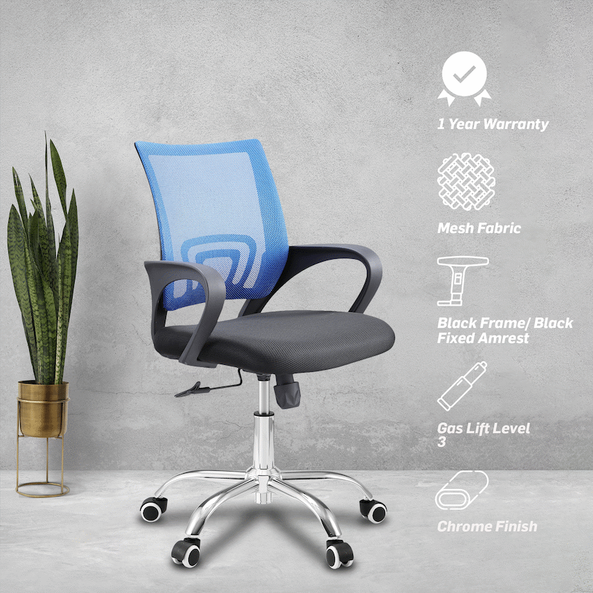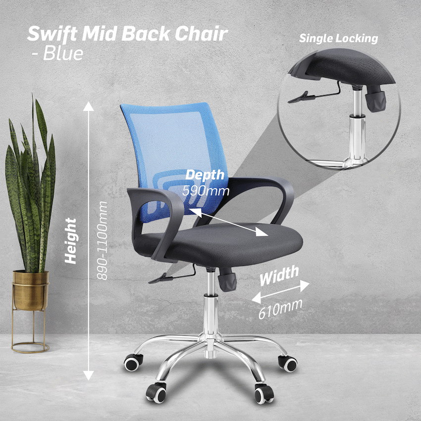 Enjoy reliable comfort and flexibility with the Everfurn Swift Ergonomic Mesh Office Chair with Armrests, designed to support you throughout busy workdays. Ideal for home offices and professional workspaces, this mesh office chair combines breathable materials with practical adjustability to help reduce fatigue and improve sitting comfort.The breathable mesh backrest promotes airflow, helping you stay cool and focused during extended periods of sitting. A smooth height adjustment mechanism allows the chair to adapt easily to different desk heights and body types, making it a versatile adjustable office chair for daily use. The mid-back design offers supportive comfort while maintaining a compact footprint, perfect for modern work environments.Integrated armrests provide added support for your arms and shoulders, encouraging a more relaxed posture. The single-lock tilt mechanism allows you to recline comfortably, promoting subtle movement that helps reduce stiffness during long hours at your desk. Finished with a rust- and scratch-resistant chrome base, the Swift chair delivers both durability and a clean, professional look.Designed with everyday ergonomics in mind, the Everfurn Swift offers dependable support, breathable comfort, and smooth adjustability-making it an excellent ergonomic office chair for productive workdays.Feature HighlightsBREATHABLE MESH BACKREST – Promotes airflow to keep you cool and comfortableERGONOMIC MID-BACK DESIGN – Supports posture without taking up excess spaceHEIGHT ADJUSTABLE SEATING – Easily customise the chair to suit different users and desk heightsSINGLE-LOCK TILT MECHANISM – Allows comfortable reclining to encourage movement and reduce fatigueINTEGRATED ARMRESTS – Provides added arm and shoulder supportCHROME BASE FINISH – Rust- and scratch-resistant for lasting durability120KG WEIGHT CAPACITY – Built to support everyday office useTechnical SpecificationsFabrication: Mesh and fabricBase: Chrome base (280mm)Adjustment Mechanism: Single-lock tiltGas Lift: Class 3Cushioning: Hybrid foamMaximum Weight Capacity: 120kgWarranty: 1 YearDimensionsWidth: 610mmDepth: 590mmHeight: 890-1100mmWeight: 11.5kgWhat’s in the Box1 x Everfurn Swift Mid Back Chair – BlueInstruction ManualStay cool, supported, and productive with an ergonomic mesh office chair designed for comfort and everyday performance..