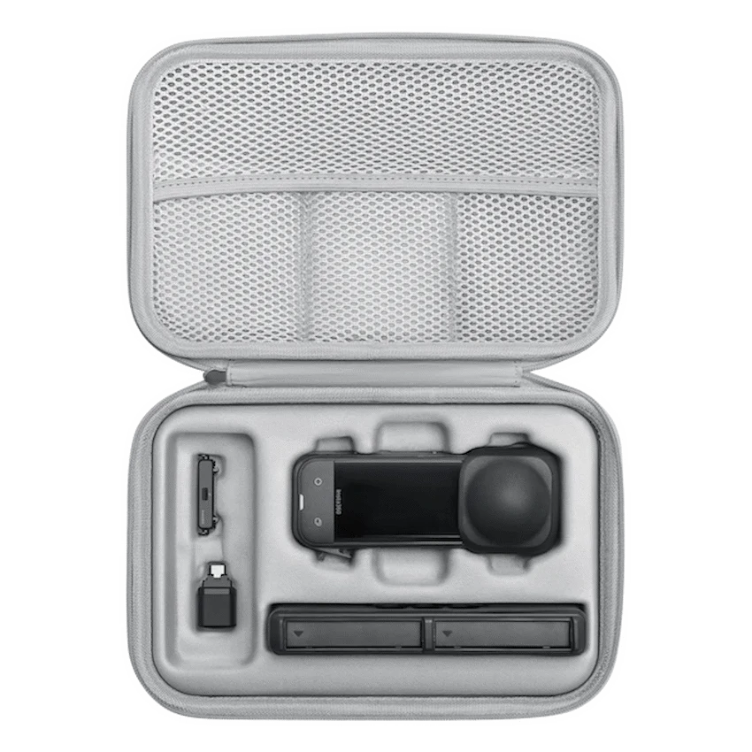 The Insta360 X5 Carry Case is a compact, durable storage solution designed to protect your X5 camera and essential accessories on the go. Featuring a rigid, hard-shell exterior with a custom-molded interior, it securely houses the camera, spare batteries, fast charging case, cables, quick release mount, and even a selfie stick in the external side sleeve. The soft fabric exterior combines lightweight portability with style, while an internal mesh pocket offers extra space for small accessories. A fabric wrist strap on the outside ensures easy carrying, making it perfect for photographers and creators who need organized, reliable protection for their gear during travel or outdoor shoots.