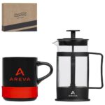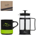 Made from high-quality A-Grade ceramic, the black mug in this set has a silicone band, which accentuates branding that matches the band colour. It’s combined with a black coffee plunger, ideal for making a single cup of coffee. mug: 10 ( h ) cm A-Grade ceramic ceramic & silicone 320ml plunger: 16 ( h ) cm borosilicate glass & PP 350ml presentation box: 24.5 ( l ) x 19 ( w ) x 9.5 ( h ) cm packaged in a Kooshty presentation box