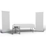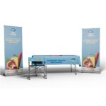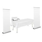 Ideal for trade shows, expos, and brand activation. set includes: x 2 Ovation Pull Up Banners with PVC Skin and Bag x 1 Legend Fabric Tablecloth 2.5m x 1.5 m x 1 Coated Steel Directors Chair