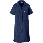 190g/m2 polycotton twill open neck collar 5 button closure mitered chest pocket two bottom pockets bust darts garment features top stitching and bar tacks at stress points closed back, longer length garment