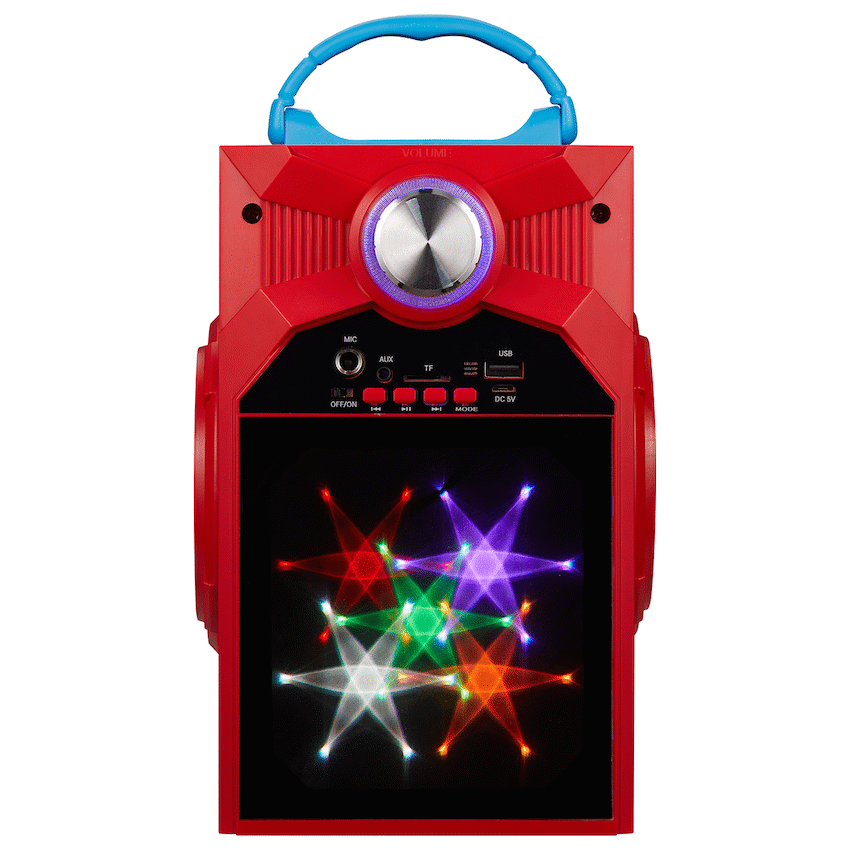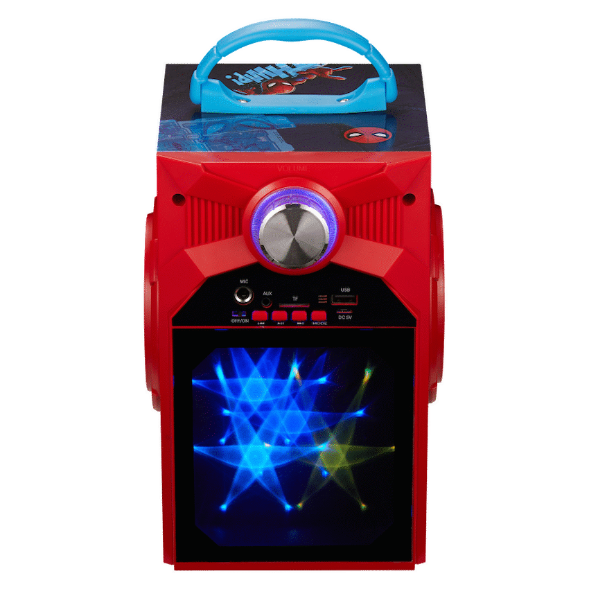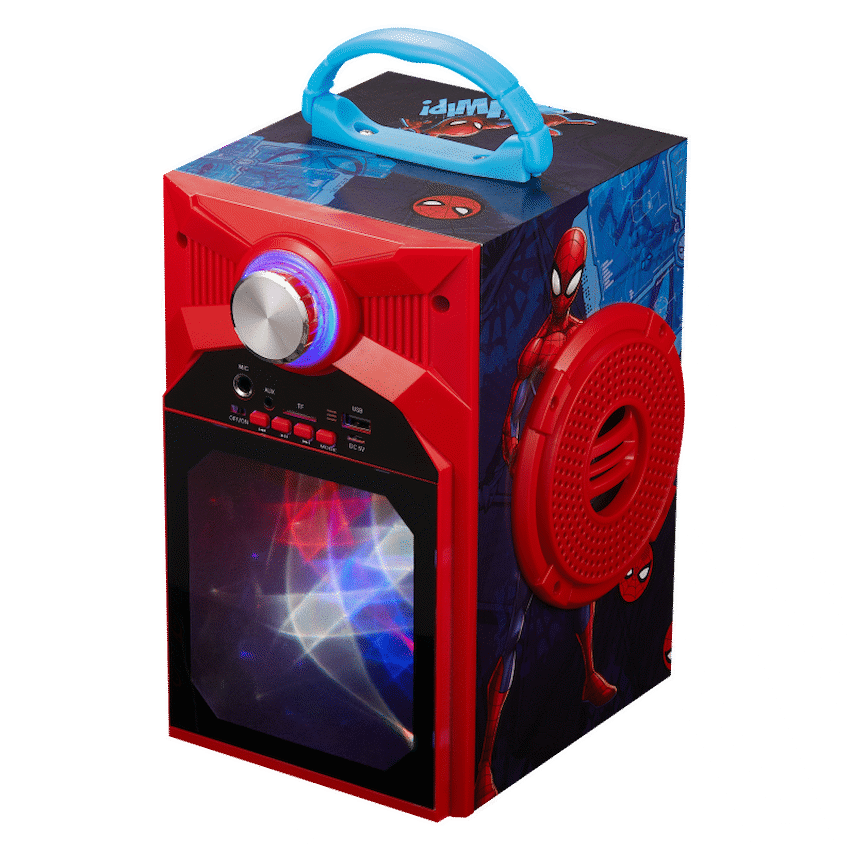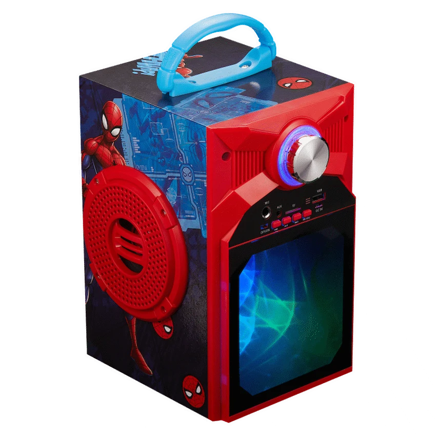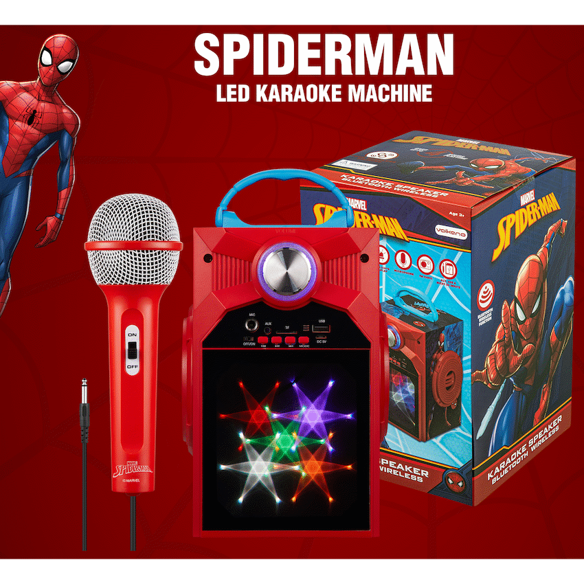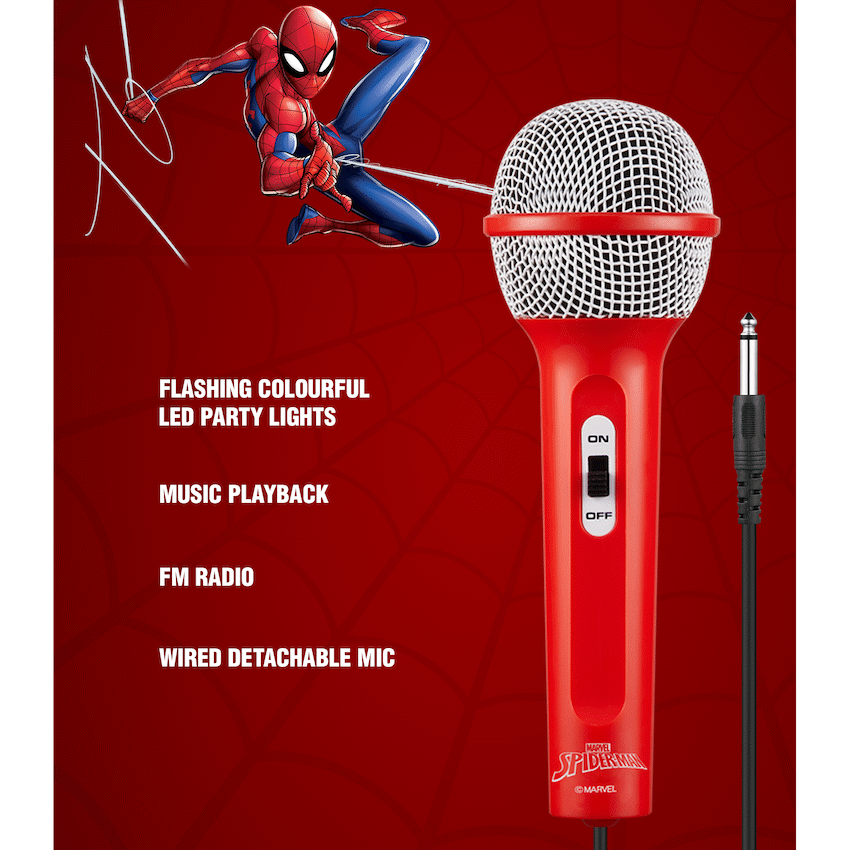 Get the party started with the Marvel Spider-Man Galaxy Series Karaoke Machine-the ultimate entertainment hub for young superheroes! This action-packed karaoke speaker combines powerful sound, bright LED star lights, and a built-in wired microphone for hours of musical fun. Whether it’s for birthdays, weekend jams, or family karaoke nights, this all-in-one machine delivers fun, freedom, and flair.With Bluetooth 5.3 connectivity, your little one can stream songs wirelessly from any smartphone or tablet. Plus, you get multiple audio input options, including USB, SD card, AUX, and even FM radio-making it the perfect choice for any mini DJ or performer. The front panel lights up with vibrant colours, adding a party vibe to every performance, while the compact build makes it ideal for use at home or on the go.Feature HighlightsBuilt-In Karaoke with Wired Mic – Everything you need for instant sing-alongsBluetooth Streaming – Wirelessly connect to phones or tablets with easeColourful LED Star Lights – Light up the room with a vibrant party atmosphereMultiple Playback Options – Supports USB, SD card, AUX input & FM radioRechargeable Battery – Enjoy 2-4 hours of wireless playtimeCompact & Kid-Friendly Design – Lightweight and easy for kids to use or carryTechnical SpecificationsBluetooth Version: 5.3Bluetooth Chipset: Bluetrum 5602BBluetooth Range: 10mBattery: 3.7V, 1200mAhCharging Time: 3-4 HoursPlaytime: 3-4 Hours (50% Volume), 2-3 Hours (100% Volume)Max USB/SD Card Input: 32GBFrequency Response: 100Hz – 20kHzSignal-to-Noise Ratio: ?60dBSensitivity: 90dBSpeaker Output: 10W RMS (2 x 5W)Driver Size: 4″Impedance: 3?Product Dimensions: 180 x 160 x 257mmWhat’s in the BoxMarvel Spider-Man Galaxy LED Stars Karaoke MachineMarvel Spider-Man Wired MicrophoneUSB Charging CableAUX CableInstruction ManualLet your child sing, shine and shine even brighter with Spider-Man karaoke magic-where music, lights, and heroic fun come together!