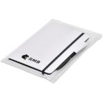 The matching matte textures of this notebook and pen, combined with the colour accents, make them perfect partners. The pouch is made from good quality PVC, and has a ziplock closure. It’s tactile and durable, and can be reused for storing folded documents, cards, notes and other odds ‘n ends.   25.5 ( l ) x 17.5 ( w ) x 1.2 ( h ) cm   This set includes:   Notebook: 21 ( l ) x 14.3 ( w ) x 1.3 ( h ) cm paper and pu 128 lined pages (64 sheets) colour page edges Quest Ball Pen ABS black German ink   When selecting the dome sticker branding option, please note that debossing is required at an additional charge. This process creates a recess for the dome sticker to fit into, reducing the chance of it peeling off easily.