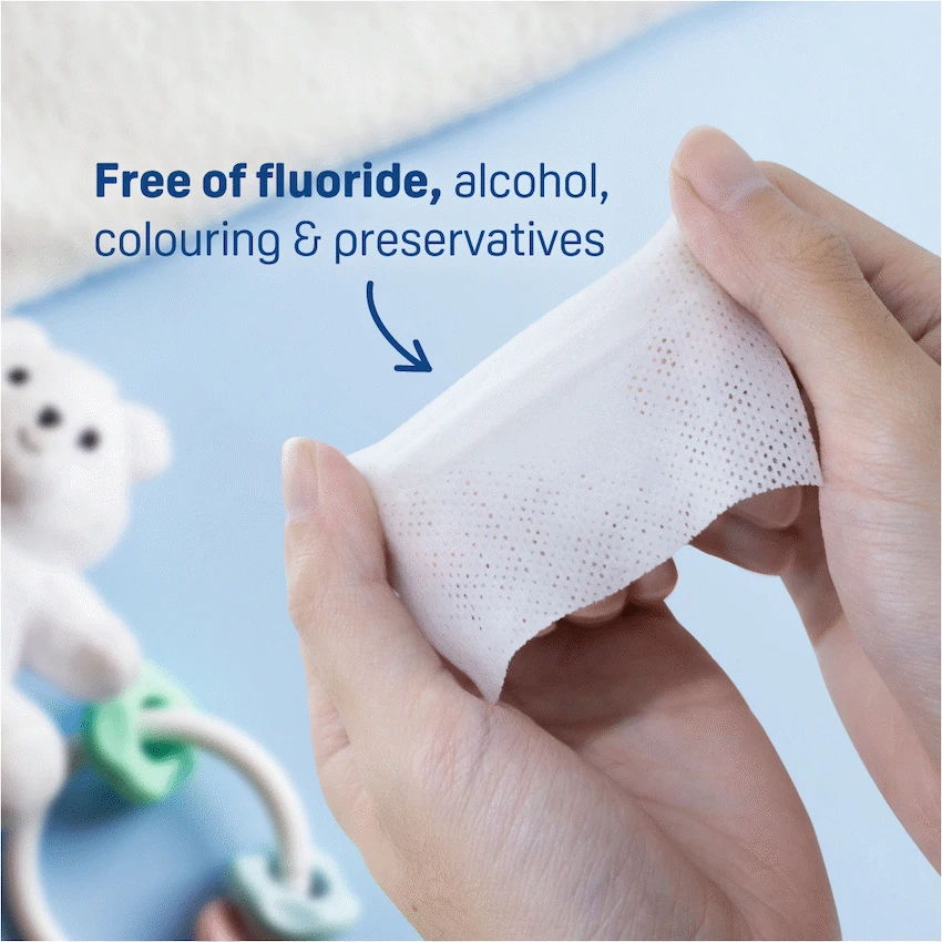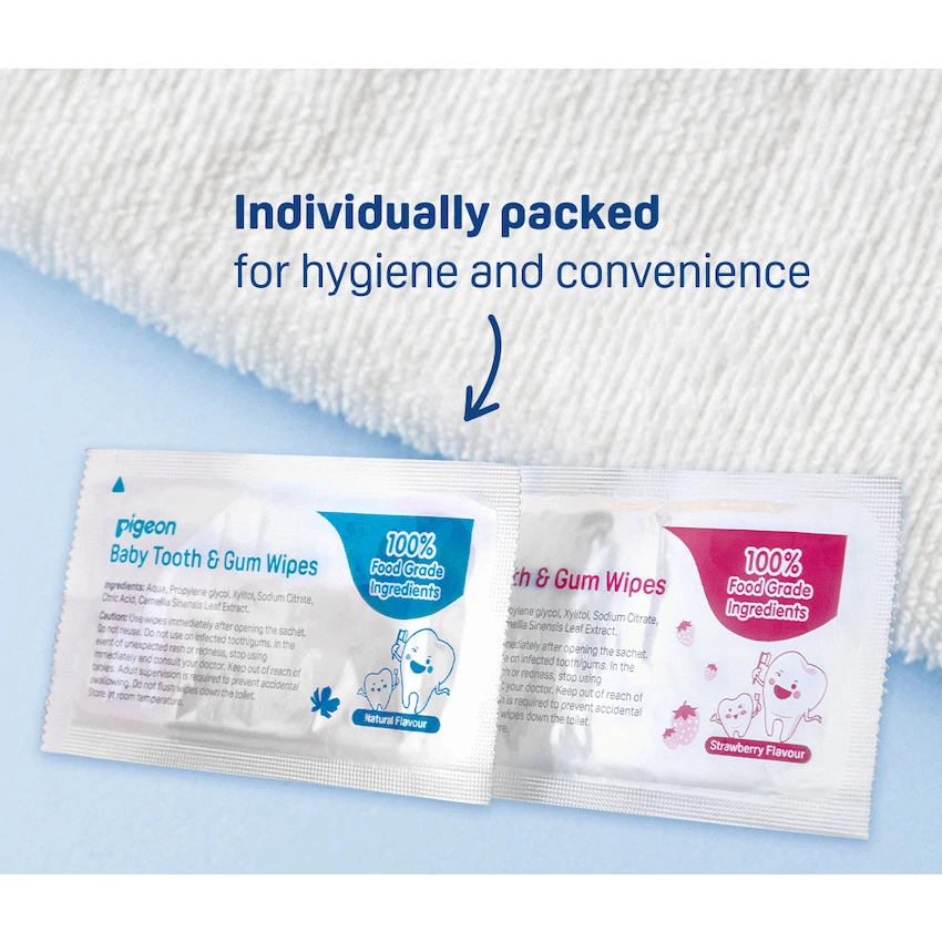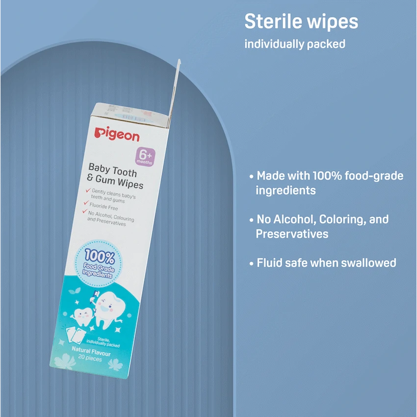 To kick-start your baby’s oral care journey, Pigeon Baby Tooth & Gum Wipes are formulated with 100% food-grade ingredients for a gentle and safe clean. Each wipe is individually packed for convenient use in cleaning your baby’s teeth and gums, removing food particles effectively. Natural flavor. Fluoride, alcohol, colouring and preservatives.