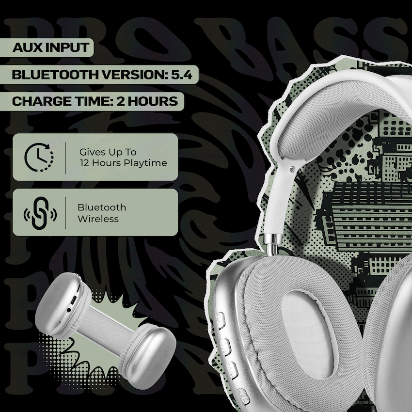 Enjoy immersive sound and all-day comfort with the Pro Bass Urban Groove Bluetooth Headphones. Designed for everyday users who demand performance and flexibility, these over-ear wireless headphones deliver up to 12 hours of playtime, making them perfect for work, travel, or leisure. With Bluetooth 6.0, you get stable connectivity for uninterrupted audio.Need to take calls or activate your voice assistant A built-in microphone lets you enjoy hands-free calling and access to Google or Siri voice control with a simple command. Multiple input options-including Bluetooth, USB-C charging, and an aux input which mean you’re never out of options, even when your battery runs low.Whether you’re streaming music, gaming, or jumping into online meetings, the Urban Groove Series delivers quality sound with a stylish, lightweight design you’ll want to wear every day.Feature Highlights:Up to 12 Hours Playtime – Wireless audio that keeps up with your dayHands-Free Calling – Clear calls with built-in mic for work or chatGoogle & Siri Voice Control – Easy access to smart assistants on the goUSB-C Charging – Fast, reliable recharging with modern compatibilityMultiple Input Options – Use Bluetooth, aux cable, or SD card playback40mm Drivers – Delivers rich audio and detailed soundOver-Ear Fit – Cushioned for comfort during long listening sessionsTechnical Specifications:Bluetooth Version: 6.0Chipset: JLSupported Profiles: A2DP, AVCTP, AVDTP, AVRCP, HFP, SPP, SMP, ATT, GAP, GATT, RFCOMM, SDP, L2CAPBluetooth Range: 10mImpedance: 32?Frequency Range: 20Hz-20kHzSensitivity: 100dBDriver Size: 40mmBattery: 350mAhCharging Time: 1.5-2 HoursCharging Input: DC 5V (USB-C)Playtime: 12 Hours (50% Volume), 10 Hours (100% Volume)What’s in the Box:Pro Bass Urban Groove Series Bluetooth HeadphonesUSB-C Charging CableAux CableInstruction ManualStay wireless, stay connected-wherever your rhythm takes you.