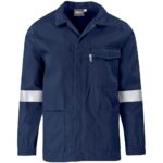 300g/m2 100% D59 flame retardant and acid-resistant cotton twill open neck collar • front yoke panel • concealed zip • chest pocket features V-flap with concealed press stud closure two front pockets • elasticated cuffs • triple needle top stitching • bar tacks at stress points silver 50mm flame retardant reflective tape detail SABS approved Manufactured in the SADC Region SABS approved, click here to view certification