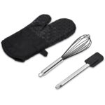 Pastry Chef Baking Utensils: Silicone whisk with stainless steel handle Silicone spatula with stainless steel handle Serendipio Tanoreen Oven Glove (Single) 32 ( l ) x 16 ( w ) cm 180g/m2 cotton & silicone heat resistant silicone pattern on the back and front of the glove padded, quilted, and lined hang loop Bianca Gift Box A 30 ( l ) x 23 ( w ) x 10 ( h ) cm 1.2mm E flute corrugated board natural colour inside and out foldable cardboard gift box the self-erect box is delivered flat for transport purposes, but it’s quick and easy to assemble Regalo Gift Box Filler 26 ( l ) x 14.5 ( w ) cm shredded paper 30 grams of shredded paper supplied in a polybag