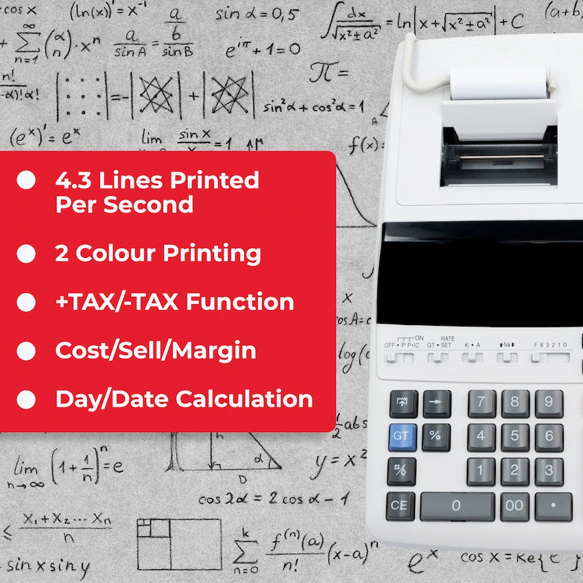 12 Digit Printing Calculator with a printing speed of 4.5 lines per second. Includes a mark up function, average and add or subtract tax functions. It has a 2 colour print.Tech Specs and Features:Display Type – DigitronNumber of Display Digits – 12Automatic Power Down – yesPower Supply – MainsBackup Battery – CR2032 x1Keys – PlasticDimensions – 327 x 221 x 78 mmWeight – 2000gPrint:Printing Colours – Black, RedPrinting Speed – 4.3 Lines/sec.Paperroll (Size) – Standard (58 x 80 mm)Ink Ribbon – yesInk Roller – no