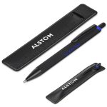 This metal ball pen has a matte black top coating with a chrome underlay. The shiny underlay matches the trim accent of the pen, and is revealed when your logo is engraved on the barrel. The ball pen refill contains good quality, black German ink and will provide smooth, uninterrupted writing for a minimum of 1,500 metres. Presented in a black PU pen pouch. Ball Pen: aluminium with black German ink Pouch: 16 ( l ) x 3 ( w ) cm PU