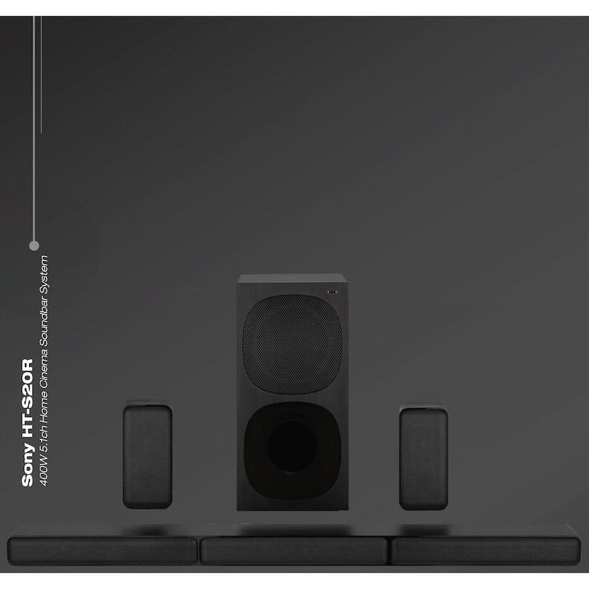 The Sony HT-S20R, your ticket to the best seat in the house for an immersive audio experience. This sound system, comprised of a soundbar, subwoofer, and rear speakers, creates authentic surround sound that puts you at the heart of all your favorite movies. With a powerful 400W output and Dolby Digital , every movie scene comes to life with stunning clarity. Featuring five speakers and a subwoofer, the HT-S20R delivers big, full-frequency sound that fills your space. Dive into the cinematic world with dramatic surround sound from 5.1 separate audio channels and Dolby Digital technology. Tailor your audio experience with a dedicated button for every sound – choose from Auto, Standard, Cinema, Music, Night, and Voice modes. Fine-tune your viewing experience with subwoofer volume control. But it’s not just about movies and TV – easily play your favorite music through the soundbar. Setting up the HT-S20R is a breeze; it’s almost ready to go straight out of the box. Simply plug it in, connect your main bar speaker and rear speakers via color-coded connections, position the wired subwoofer and rear speakers, and enjoy 5.1 channels of real surround sound.