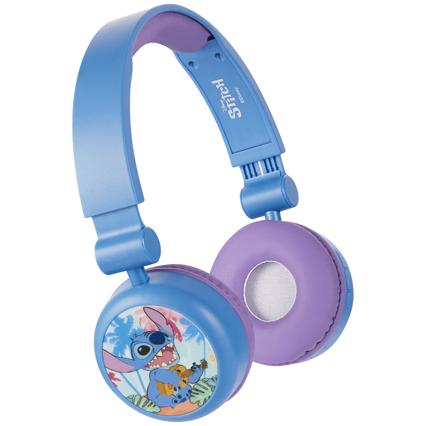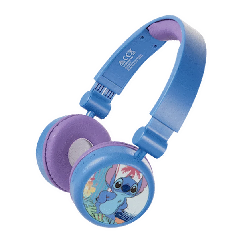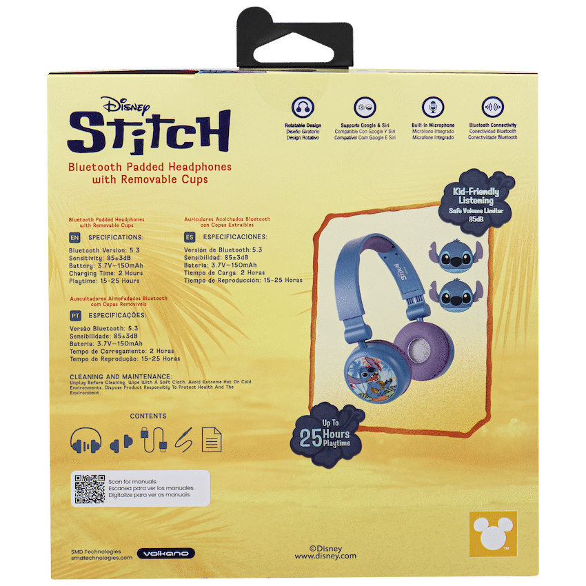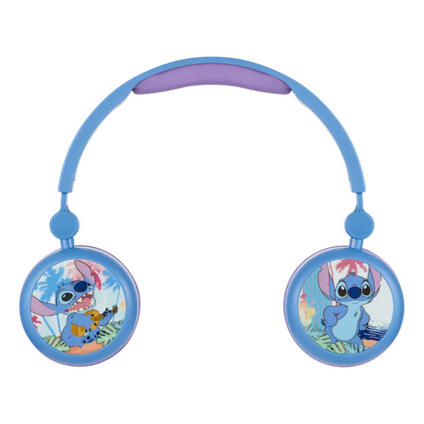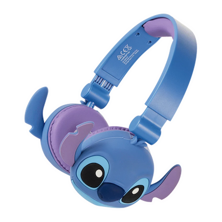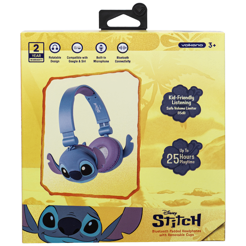 Let your kids enjoy their favourite tunes in style with the Disney Stitch Bluetooth Padded Headphones – the perfect blend of fun and functionality. Designed with young ears in mind, these kids Bluetooth headphones feature volume-limiting technology to ensure safe listening levels, giving parents peace of mind. With a bold Stitch design and 3D removable silicone ear cups, they make the ideal companion for school, travel, or quiet time at home.Thanks to Bluetooth 5.3, these wireless headphones for children deliver a stable connection and high-quality audio, while the long-lasting battery offers up to 25 hours of playtime at moderate volume. The lightweight build and rotatable cup design ensure a comfy fit for growing heads, and when it’s time to chat with friends or activate a voice assistant, the built-in mic and voice assistant support have you covered.Feature HighlightsKid-Safe Listening Volume – Limits sound to protect young earsUp to 25 Hours Playtime – Long-lasting use between charges3D Removable Silicone Cups – Fun Stitch-themed design with easy cleaningBluetooth 5.3 Wireless Connectivity – Stable and quick pairing up to 10mRotatable Cup Design – Adjustable fit for all-day comfortHands-Free Calling – Built-in mic for easy communicationVoice Assistant Support – Convenient access to voice control featuresTechnical SpecificationsBluetooth Version: 5.3Chipset: AB5656BRange: 8-10mImpedance: 32 ?Frequency Range: 20 Hz – 20 kHzSensitivity: 85 +/- 3 dBBattery: 3.7V, 150 mAhDriver Size: 40mmCharging Port: USB-CCharging Time: 2 HoursPlaytime: Up to 25 Hours (50% Volume), 15 Hours (100% Volume)What’s in the BoxDisney Stitch Bluetooth Padded Headphones with Removable CupsUSB-C Charging Cable3.5mm Aux Audio CableInstruction ManualLet your little one enjoy safe, wireless audio with a touch of Disney magic-perfect for music, learning, and everyday fun.