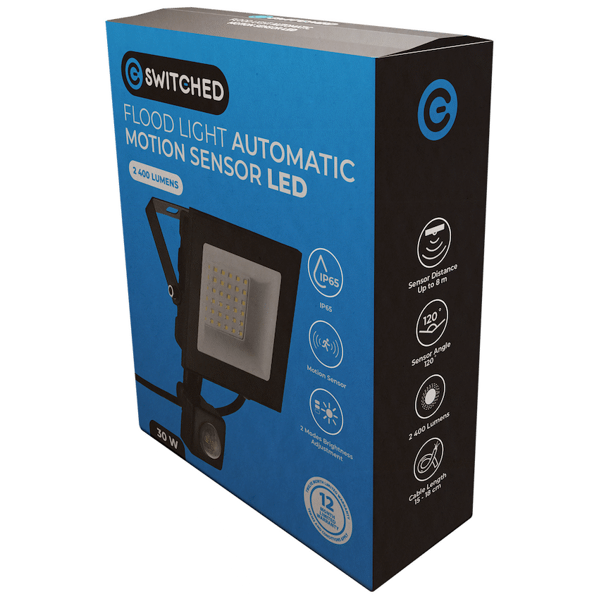 Protect your property with the Switched 30W LED Motion Sensor Flood Light, a powerful and efficient LED motion sensor flood light designed for bright, automatic illumination. Delivering 2400 lumens of cool white light (6500K), it instantly lights up when motion is detected-perfect for driveways, gardens, garages, and building entrances.Built tough with an IP65 waterproof rating, this outdoor security light South Africa is engineered to withstand rain, dust, and outdoor conditions. The integrated PIR motion sensor offers a 120deg detection range with up to 8 metres of distance, giving you reliable coverage when you need it most.Customise operation with adjustable delay time (5-900 seconds) and dual day/night modes-choose “A” for night-only activation or “B” for round-the-clock use. This waterproof motion sensor light combines security, efficiency, and convenience in a sleek, easy-to-install design that’s perfect for homes and businesses alike.