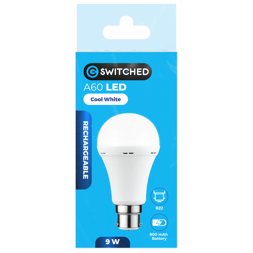 Switched 9w A60 Rechargeable LED Light Bulb – B22 – Cool White