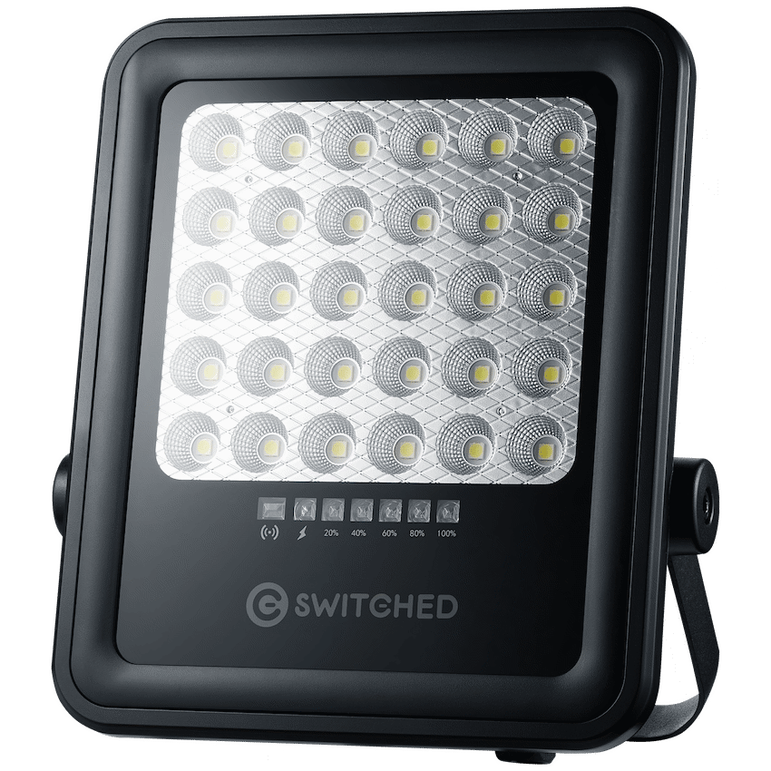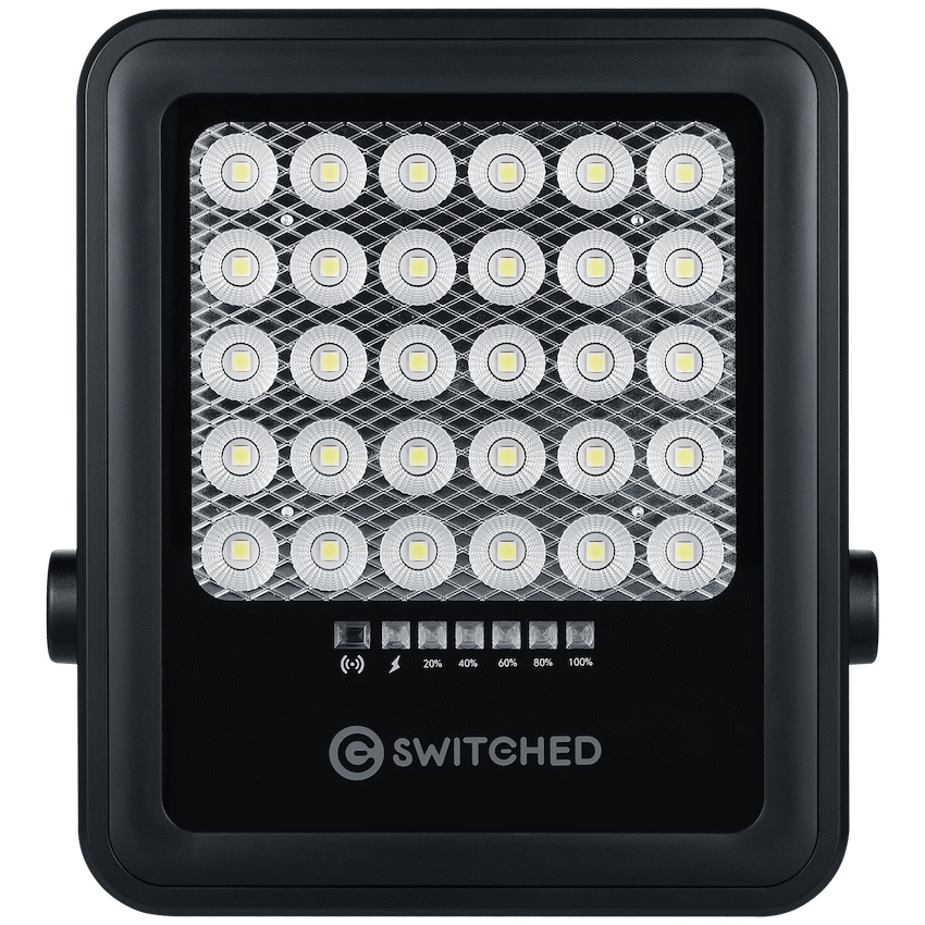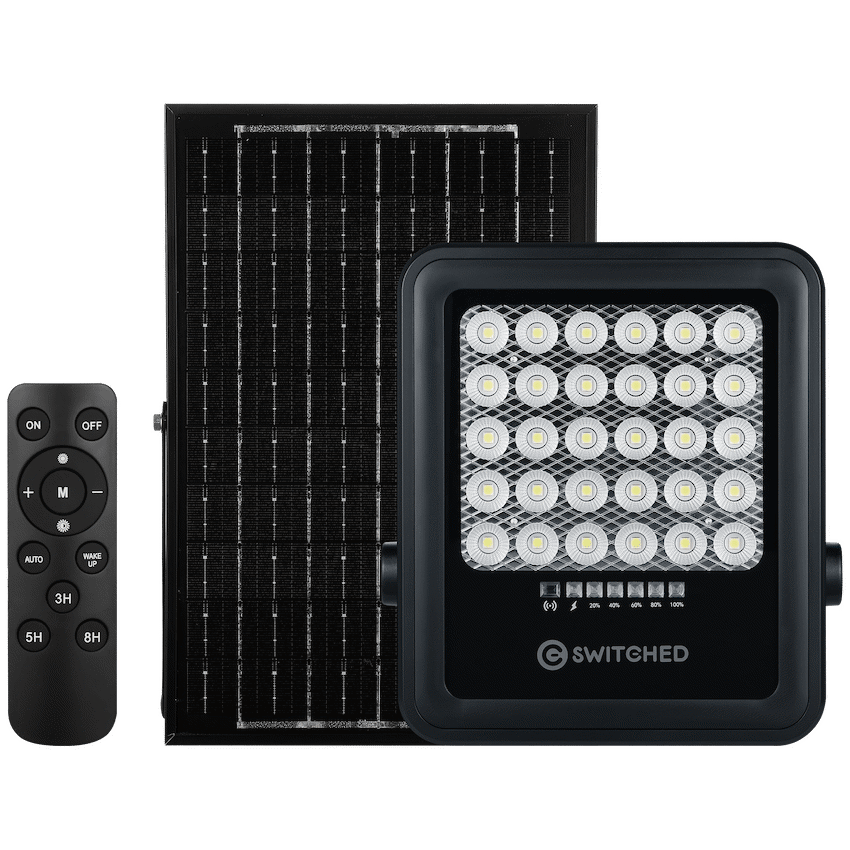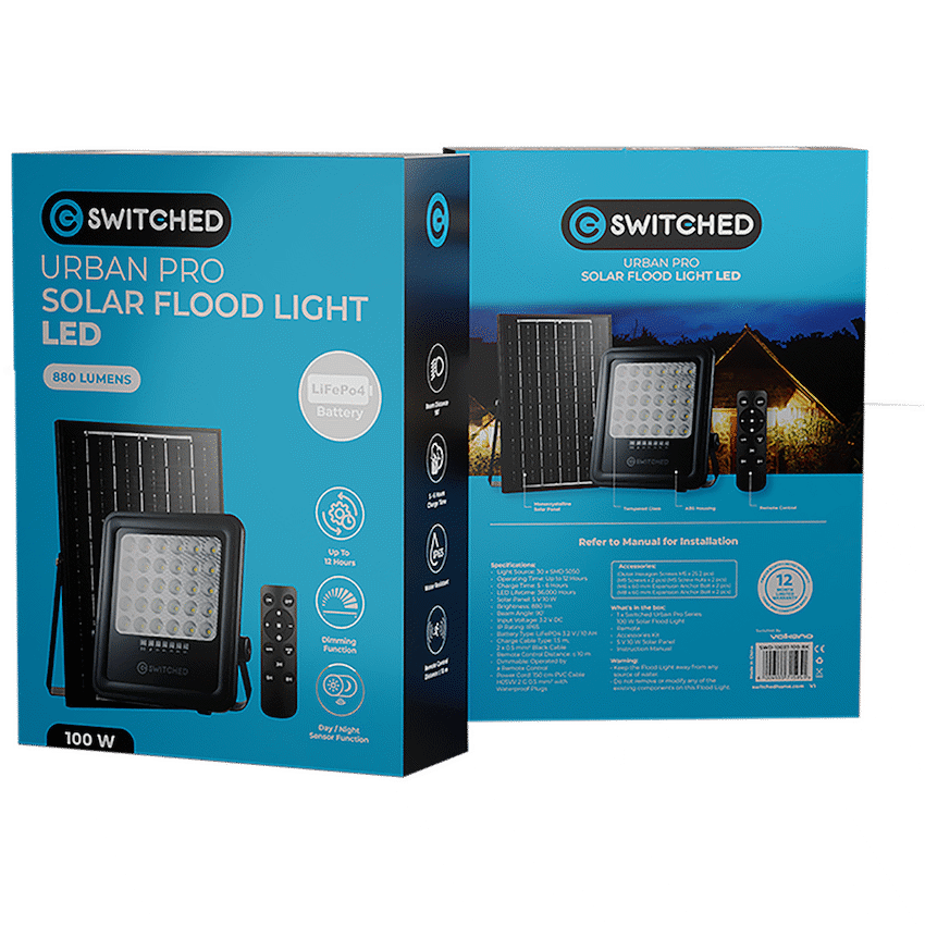 Illuminate large outdoor areas effortlessly with the Switched Urban PRO Series 100W Solar Floodlight with Remote, a durable and efficient solar floodlight South Africa solution built for homes, driveways, and security lighting. Powered entirely by the sun, this off-grid lighting system offers bright illumination, smart controls, and weatherproof reliability-all without increasing your electricity bill.Featuring 20 high-performance SMD 5050 LEDs, this outdoor solar security light produces up to 880 lumens of brightness, supported by a high-capacity LifePO4 10,000mAh battery for up to 12 hours of continuous operation. The 5V 10W solar panel charges the unit in 5-6 hours, ensuring dependable night-time lighting.Equipped with day/night and motion sensor functions, dimming capability, and full remote control, the Switched solar floodlight offers seamless operation and energy-efficient performance. With an IP65 waterproof rating, it’s ideal for South African weather conditions-rain or shine.